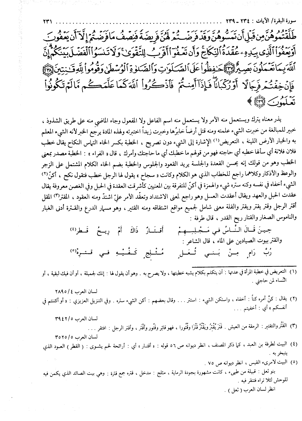طَلَّقْتُمُوهُنَّ مِن قَبْلِ أَن تَمَسُّوهُنَّ وَقَدْ فَرَضْتُمْ لَهُنَّ فَرِيضَةً فَنِصْفُ مَا فَرَضْتُمْ إَّلاأَن يَعْفُونَ أَوْ يَعْفُوَاْ الَّذِى بِيَدِهِ عُقْدَةُ النِّكَاحِ وَأَن تَعْفُواْ أَقْرَبُ لِلتَّقْوَى وَلاَ تَنسَوُاْ الْفَضْلَ بَيْنَكُمْ إِنَّ اللَّهَ بِمَا تَعْمَلُونَ بَصِيرٌ حَافِظُواْ عَلَى الصَّلَوَاتِ والصَّلَواةِ الْوُسْطَى وَقُومُواْ لِلَّهِ قَانِتِينَ فَإنْ خِفْتُمْ فَرِجَالاً أَوْ رُكْبَانًا فَإِذَآ أَمِنتُمْ فَاذْكُرُواْ اللَّهَ كَمَا عَلَّمَكُم مَّا لَمْ تَكُونُواْ تَعْلَمُونَ } )