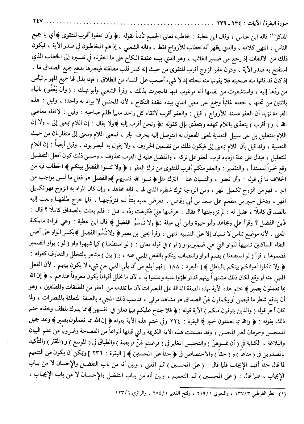 ( إِنَّ اللَّهَ بِمَا تَعْمَلُونَ بَصِيرٌ ( ختم هذه الآية بهذه الصفة الدالة على المبصرات ، لأن ما تقدمه من العفو من المطلقات والمطلقين ، وهو أن يدفع شطر ما قبضن أو يكملون لهنّ الصداق ، هو مشاهد مرئي ، فناسب ذلك المجيء بالصفة المتعلقة بالمبصرات .