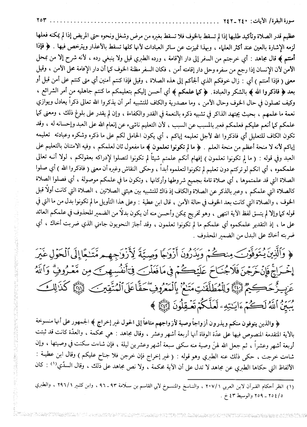 ) وَالَّذِينَ يُتَوَفَّوْنَ مِنكُمْ وَيَذَرُونَ أَزْواجًا وَصِيَّةً لاّزْوَاجِهِم مَّتَاعًا إِلَى الْحَوْلِ غَيْرَ إِخْرَاجٍ ( الجمهور على أنها منسوخة بالآية المتقدمة المنصوص فيها على عدّة الوفاة أنها أربعة أشهر وعشر ، وقال مجاهد : هي محكمة ، والعدّة كانت قد ثبتت أربعة أشهر وعشراً ، ثم جعل الله لهنّ وصية منه : سكنى سبعة أشهر وعشرين ليلة ، فإن شاءت سكنت في وصيتها ، وان شاءت خرجت . حكى ذلك عنه الطبري ، وهو قوله : ) غَيْرَ إِخْرَاجٍ فَإِنْ خَرَجْنَ فَلاَ جُنَاحَ عَلَيْكُمْ ).