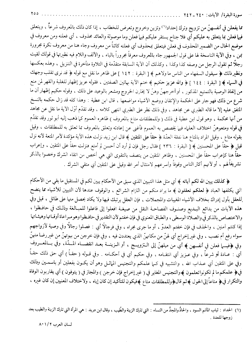 لأن التقدير في : حافظوا ، وهو مراعاة أوقاتها وهيآتها إذا كنتم آمنين ، والحذف في : فإن خفتم ، العدوّ ، أو ما جرى مجراه . وفي : فرجالاً ، أي : فصلوا رجالاً ، وفي : وصية لأزواجهم ، سواء رفع أم نصب ، وفي : غير إخراج ، أي : لهنّ من مكانهنّ الذي يعتدون فيه ، وفي : فإن خرجن من بيوتهنّ من غير رضا منهنّ ، وفي : فيما فعلن في أنفسهنّ ، أي : من ميلهنّ إلى التزويج أو الزينة بعد انقضاء المدّة وفي : بالمعروف ، أي : عادة أو شرعاً وفي : عزيز ، أي : انتقامه ، وفي : حكيم ، في أحكامه . وفي قوله : حقاً ، أي : حق ذلك حقاً ، وفي : على المتقين ، أي عذاب الله والتشبيه : في : كما عملكم ، والتجنيس المماثل : وهو أن يكون بفعلين أو بأسمين ، وذلك في : علمكم ما لم تكونوا تعلمون ، والتجنيس المغاير : في غير إخراج فان خرجهن ، والمجاز في : يتوفون ، أي يقاربون الوفاة ، والتكرار : في متاعاً إلى الحول ، ثم قال : وللمطلقات متاع ، فيكون للتأكيد إن كان إياه ولاختلاف المعنيين إن كان غيره .