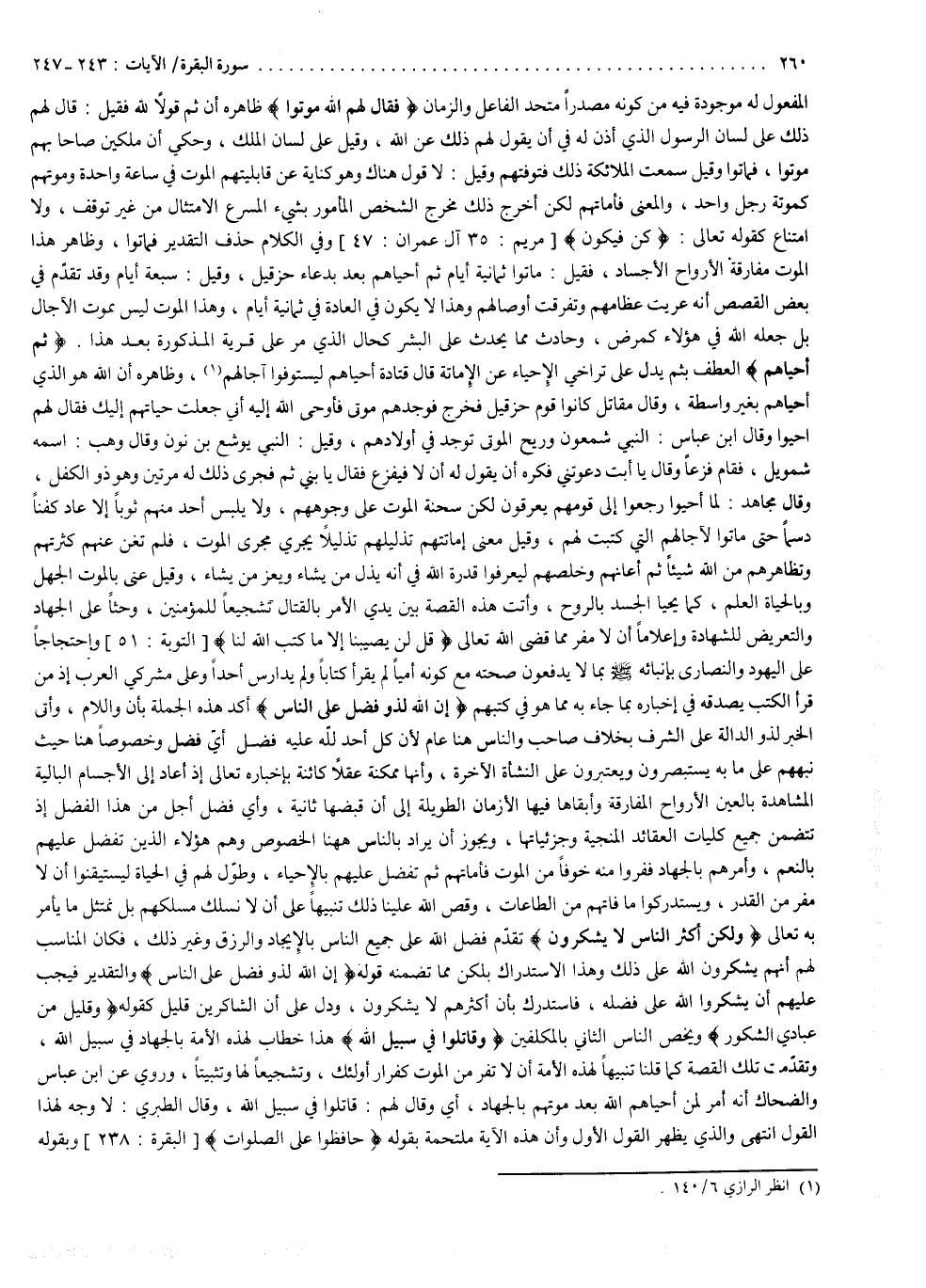 وظاهره أن الله هو الذي أحياهم بغير واسطة ، وقال مقاتل : كانوا قوم حزقيل ، فخرج فوجدهم موتى ، فأوحى الله إليه : إني جعلت حياتهم إليك ، فقال لهم : احيوا . وقال ابن عباس : النبي شمعون ، وريح الموتى توجد في أولادهم . وقيل : النبي يوشع بن نون ، وقال وهب : اسمه شمويل وهو ذو الكفل ، وقال مجاهد : لما أحيوا رجعوا إلى قومهم يعرقون ، لكن سحنة الموت على وجوههم ولا يلبس أحد منهم ثوباً إلاَّ عاد كفناً دسماً ، حتى ماتوا لآجالهم التي كتبت لهم ، وقيل : معنى إماتتهم تذليلهم تذليلاً يجري مجرى الموت ، فلم تغن ، عنهم كثرتهم وتظاهرهم من الله شيئاً ، ثم أعانهم وخلصهم ليعرفوا قدرة الله في أنه يذل من يشاء ، ويعز من يشاء ، وقيل : عنى بالموت : الجهل ، وبالحياة : العلم ، كما يحيا الجسد بالروح .