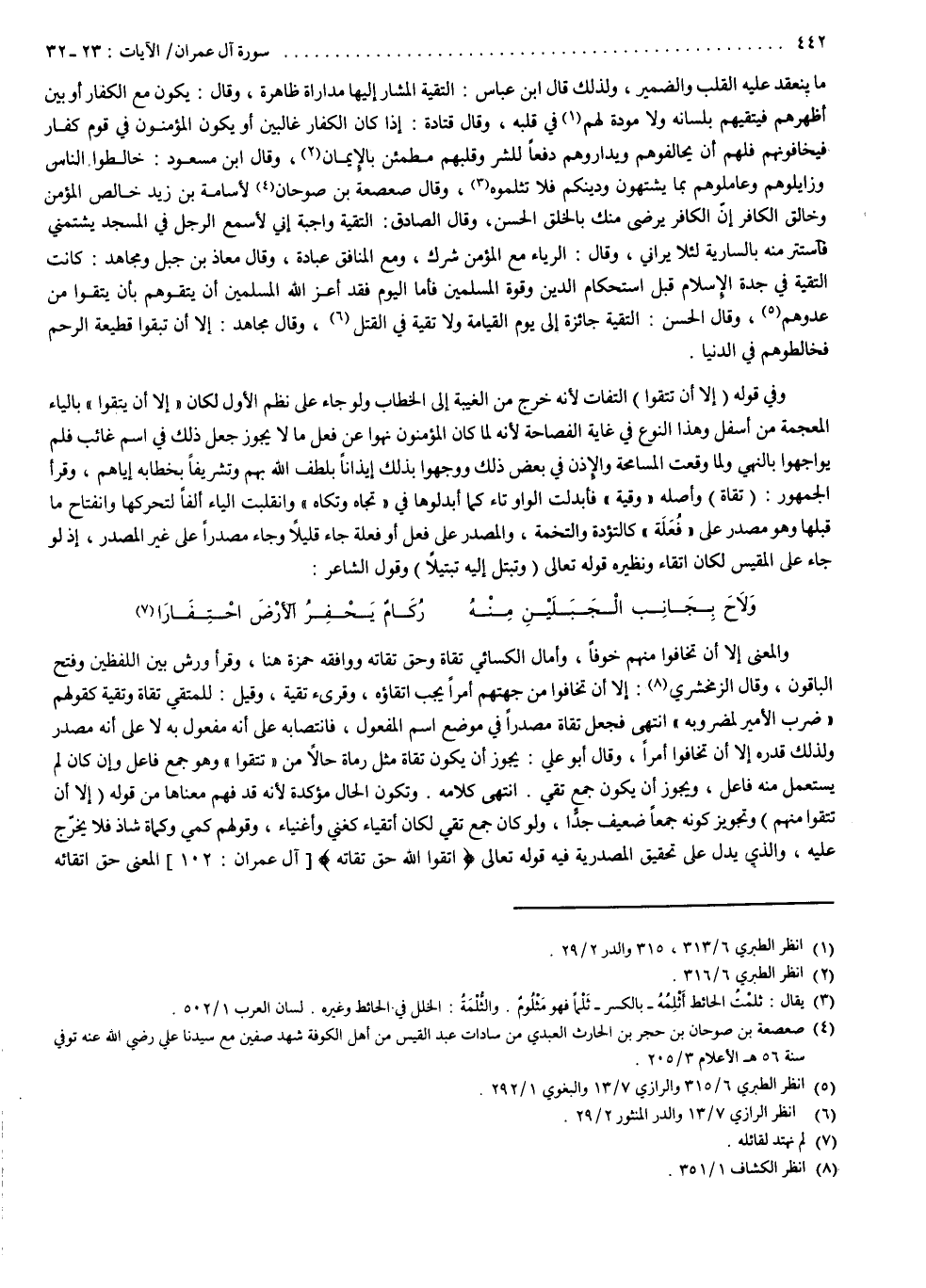 وتكون الحال مؤكدة لأنه قد فهم معناها من قوله ) إِلا أَن تَتَّقُواْ مِنْهُمْ ( وتجويز كونه جمعاً ضعيف جدّاً ، ولو كان جمع : تقي ، لكان أتقياء ، كغني وأغنياء ، وقولهم : كمي وكماة ، شاذ فلا يخرجّ عليه ، والذي يدل على تحقيق المصدرية فيه قوله تعالى : ) اتَّقُواْ اللَّهَ حَقَّ تُقَاتِهِ ( المعنى حق اتقائه ،