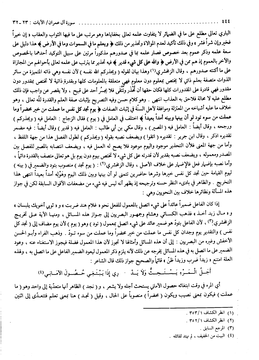 ( يَوْمَ تَجِدُ كُلُّ نَفْسٍ مَّا عَمِلَتْ مِنْ خَيْرٍ مُّحْضَرًا وَمَا عَمِلَتْ مِن سُوء تَوَدُّ لَوْ أَنَّ بَيْنَهَا وَبَيْنَهُ أَمَدَا ( اختلف في العامل في : يوم ، فقال الزجاج : العامل فيه : ويحذركم ، ورجحه . وقال أيضاً : العامل فيه : المصير . وقال مكي بن أبي طالب : العامل فيه : قدير ، وقال أيضاً : فيه مضمر تقديره اذكر . وقال ابن جرير : تقديره : اتقوا ، ويضعف نصبه بقوله : ويحذركم ، لطول الفصل . هذا من جهة اللفظ ، وأما من جهة المعنى فلأن التحذير موجود ، واليوم موعود ، فلا يصح له العمل فيه ، ويضعف انتصابه : بالمصير ، للفصل بين المصدر ومعموله ، ويضعف نصبه : بقدير ، لأن قدرته على كل شيء لا تختص بيوم دون يوم ، بل هو تعالى متصف بالقدرة دائماً . وأما نصبه باضمار فعل ، فالإضمار على خلاف الأصل .