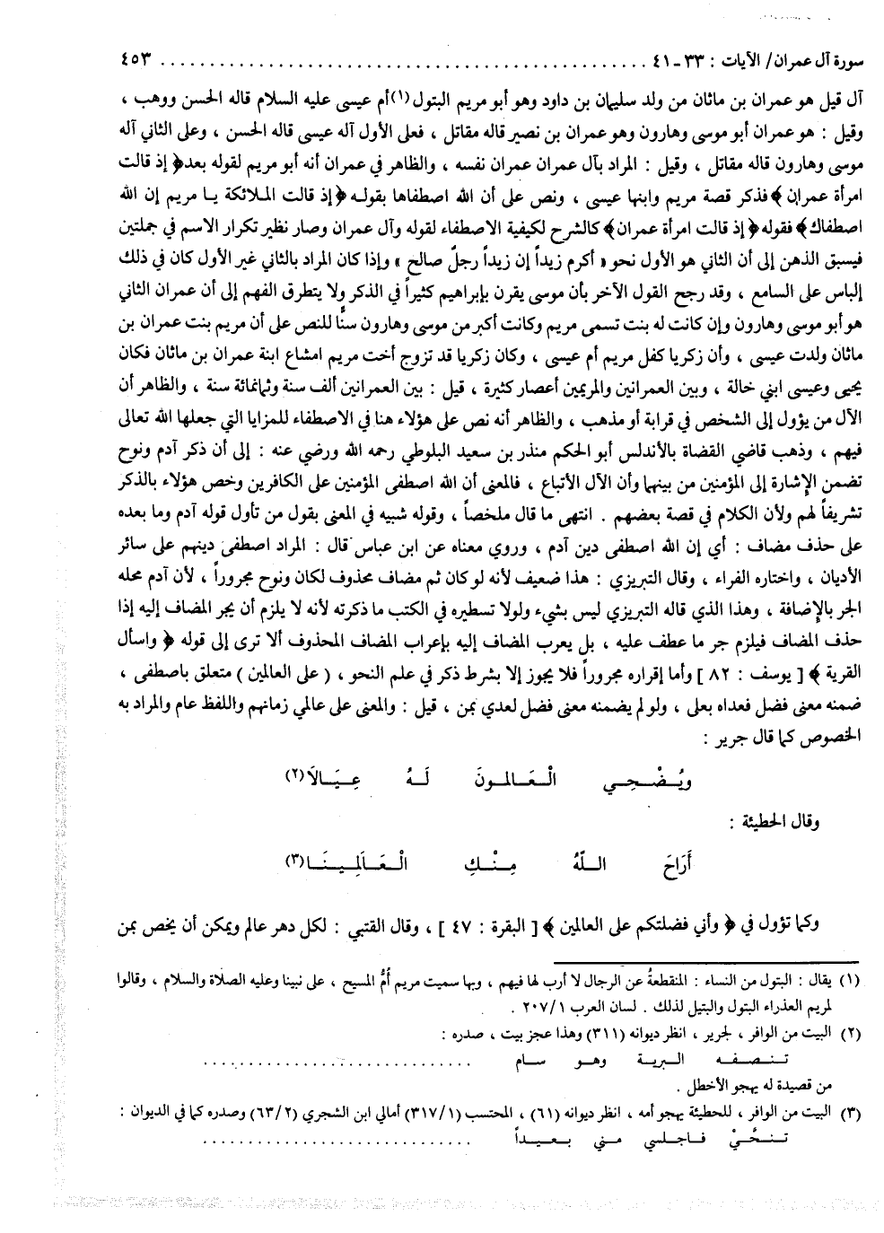 وروي معناه عن ابن عباس ، قال : المراد اصطفى دينهم على سائر الأديان ، واختاره الفراء . وقال التبريزي : هذا ضعيف ، لأنه لو كان ثَمَّ مضاف محذوف لكان : ونوح مجروراً ، لأن آدم محله الجر بالإضافة ، وهذا الذي قاله التبريزي ليس بشيء ، ولولا تسطيره في الكتب ما ذكرته . لأنه لا يلزم أن يجر المضاف إليه إذا حذف المضاف ، فيلزم جر ما عطف عليه ، بل يعرب المضاف إليه بإعراب المضاف المحذوف . ألا ترى إلى قوله واسأل القرية ؟ وأما إقراره مجروراً فلا يجوز إلا بشرط ذكر في علم النحو .