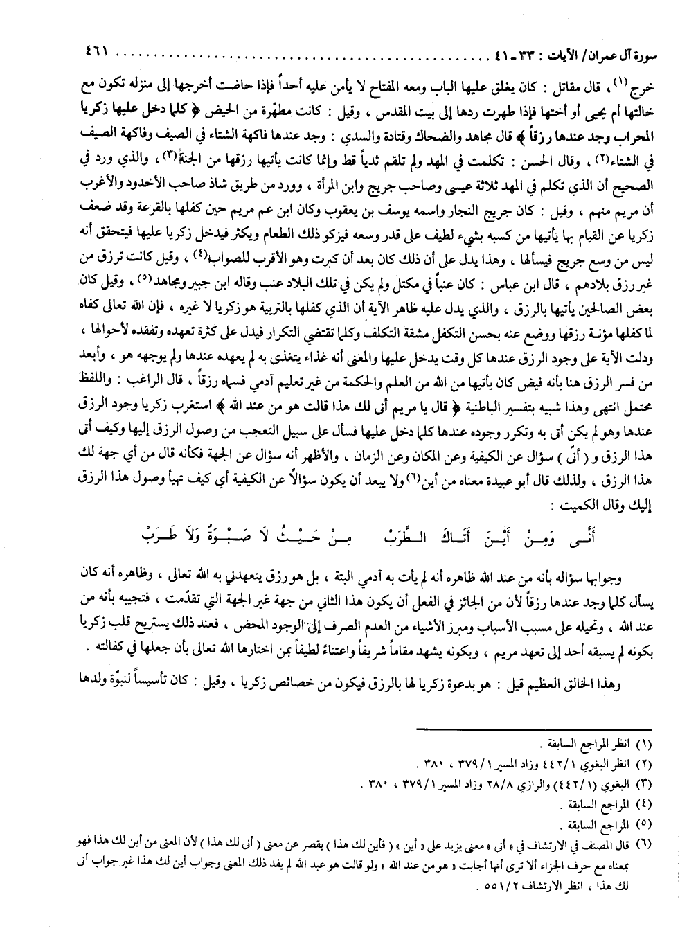 ( كُلَّمَا دَخَلَ عَلَيْهَا زَكَرِيَّا الْمِحْرَابَ وَجَدَ عِندَهَا رِزْقًا ). قال مجاهد ، والضحاك ، وقتادة ، والسدي : وجد عندها فاكهة الشتاء في الصيف ، وفاكهة الصيف في الشتاء وقال الحسن : تكلمت في المهد ولم تلقم ثدياً قط ، وإنما كانت يأتيها رزقها من الجنة .