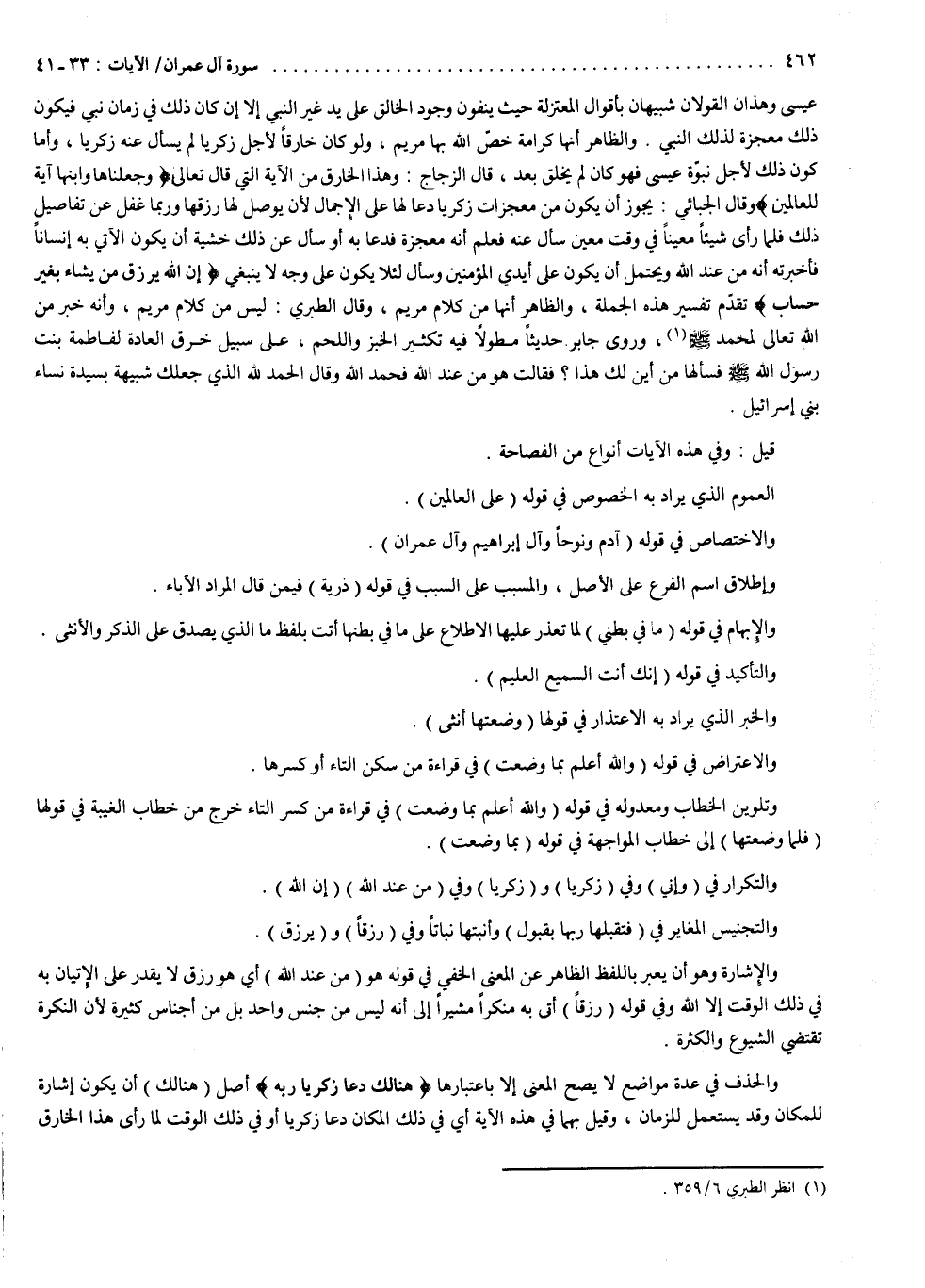 قيل : وفي هذه الآيات أنواع من الفصاحة . العموم الذي يراد به الخصوص في قوله : على العالمين ، والإختصاص في قوله : آدم ، ونوحاً ، وآل إبراهيم ، وآل عمران . وإطلاق اسم الفرع على الأصل والمسبب على السبب ، في قوله : ذرية ، فيمن قال المراد الآدباء ، والإبهام في قوله : ما في بطني ، لما تعذر عليها الإطلاع على ما في بطنها أتت بلفظ : ما ، الذي يصدق على الذكر والأنثى ، والتأكيد في قوله : ) إِنَّكَ أَنتَ السَّمِيعُ الْعَلِيمُ ( والخبر الذي يراد به الاعتذار في قولها : وضعتها أنثى ، والاعتراض في قوله : والله أعلم بما وضعت ، في قراءة من سكن التاء أو كسرها وتلوين الخطاب ومعدوله في قوله : والله أعلم بما وضعت ، في قراءة من كسر التاء ، خرج من خطاب الغيبة في قولها : فلما وضعتها ، إلى خطاب المواجهة في قوله : بما وضعت والتكرار في : وأنى ، وفي : زكريا ، وزكريا ، وفي : من عند الله ، إن الله والتجنيس المغاير في : فتقبلها ربها بقبول ، وأنبتها نباتاً ، وفي : رزقاً ويرزق والإشارة ، وهو أن يعبر باللفظ الظاهر عن المعنى الخفي ، في قوله : هو من عند الله ، أي هو رزق لا يقدر على الإتيان به في ذلك الوقت إلاَّ الله . وفي قوله : رزقاً ، أتى به منكّراً مشيراً إلى أنه ليس من جنس واحد ، بل من أجناس كثيرة ، لأن النكرة تقتضي الشيوع والكثرة . والحذف في عدة مواضع لا يصح المعنى إلا باعتبارها .