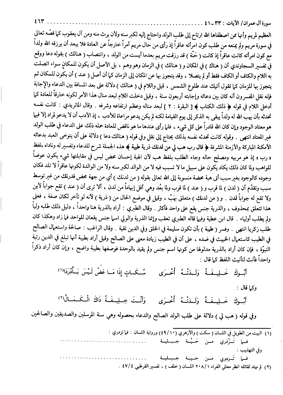 العظيم لمريم ، وأنها ممن اصطفاها الله ، ارتاح إلى طلب الولد واحتاج إليه لكبر سنه ، ولأن يرث منه ومن آل يعقوب ، كما قصه تعالى في سورة مريم ، ولم يمنعه من طلب كون امرأته عاقراً ، إذ رأى من حال مريم أمراً خارجاً عن العادة ، فلا يبعد أن يرزقه الله ولداً مع كون امرأته كانت عاقراً ، إذ كانت حنة قد رزقت مريم بعدما أيست من الولد .