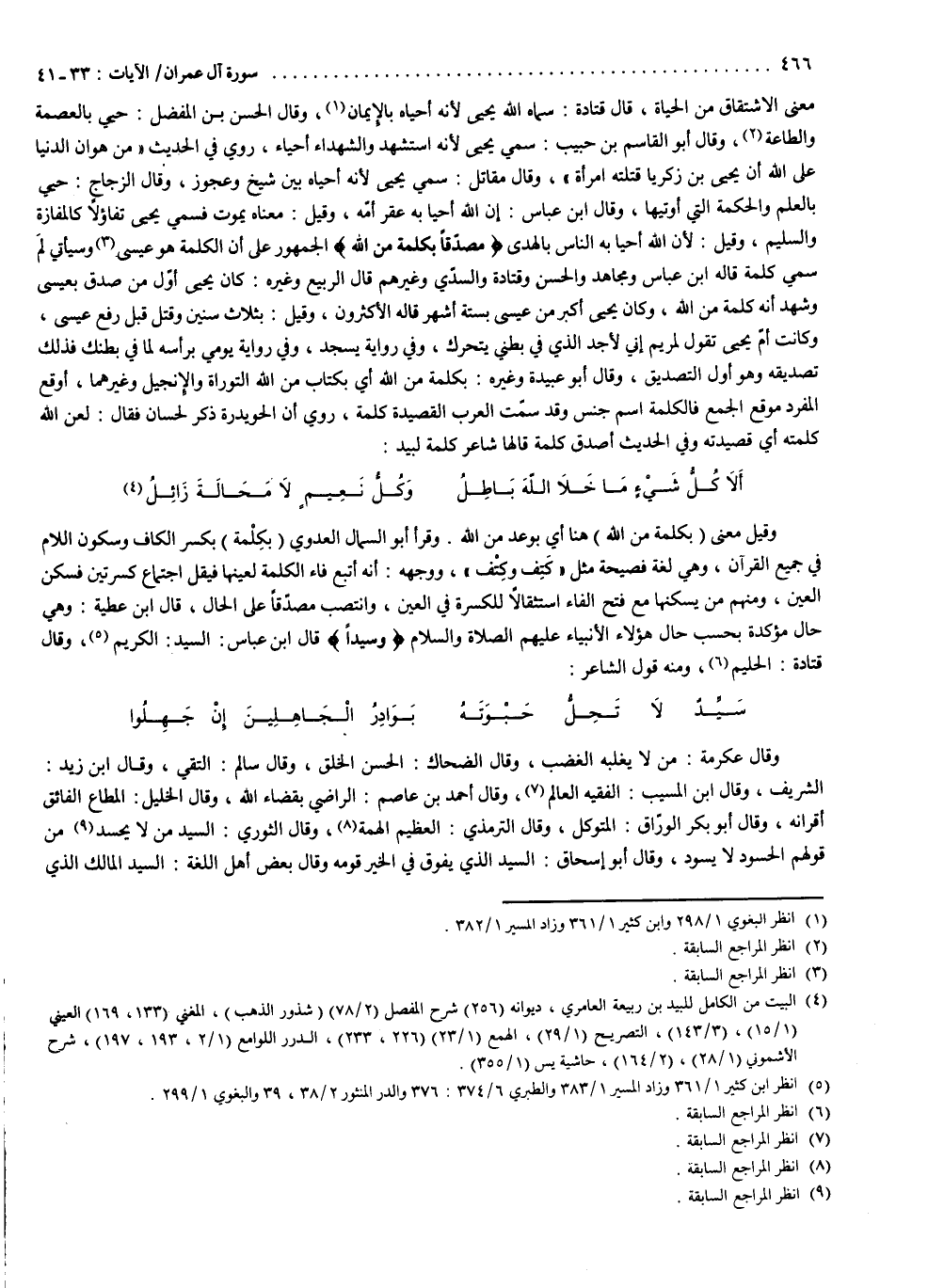 وقال أبو عبيدة ، وغيره ) بِكَلِمَةٍ مّنَ اللَّهِ ( أي : بكتاب من الله التوراة والإنجيل وغيرهما ، أوقع المفرد موقع الجمع ، فالكلمة اسم جنس ، وقد سمت العرب القصيدة كلمة روي أن الحويدرة ذكر لحسان ، فقال : لعن الله كلمته ، أي قصيدته . وفي الحديث : ( أصدق كلمة قالها شاعر كلمة لبيد : ألاكل شيء ما خلا الله باطل