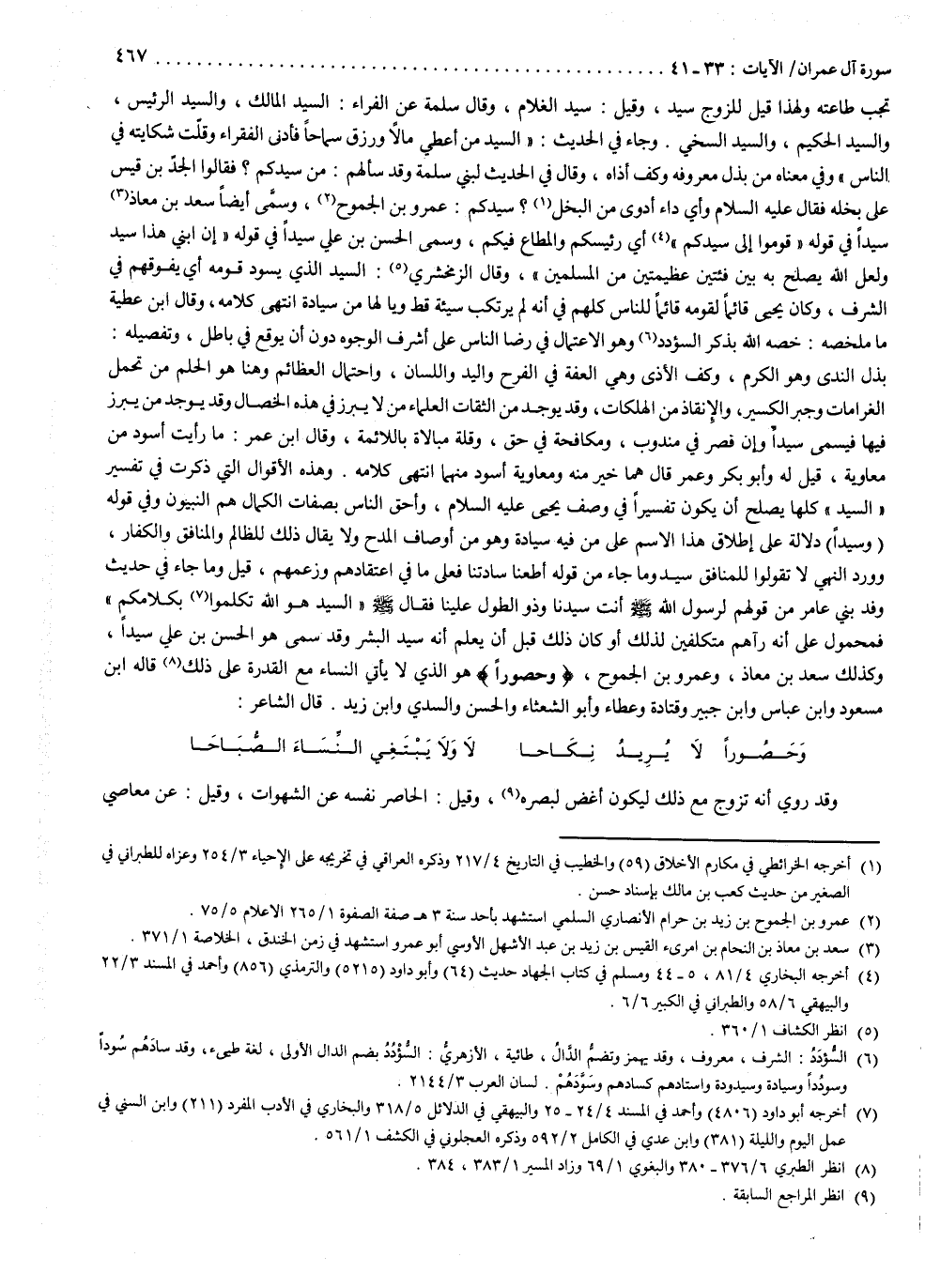 وقال الزمخشري : السيد الذي يسود قومه أي يفوقها في الشرف . وكان يحيى قائماً لقومه ، قائماً للناس كلهم في أنه لم يرتكب سيئة قط ، ويا لها من سيادة ؟ انتهى كلامه .