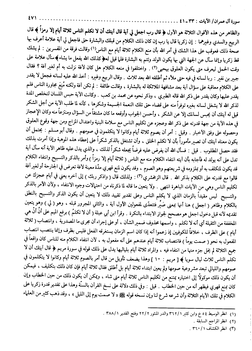 واختلفوا في منعه الكلام : هل كان لآفة نزلت به أم لغير آفة ؟ فقال جبير بن نفير : ربا لسانه في فيه حتى ملأه ، ثم أطلقه الله بعد ثلاث . وقال الربيع ، وغيره : أخذ الله عليه لسانه فجعل لا يقدر على الكلام معاقبة على سؤال آية بعد مشافهة الملائكة له بالبشارة . وقالت طائفة : لم تكن آفة ، ولكنه منع مجاورة الناس ، فلم يقدر عليها ، وكان يقدر على ذكر الله . قاله الطبري ، وذكر نحوه عن محمد بن كعب ، وكانت الآية حبس اللسان لتخلص المدة لذكر الله لا يشغل لسانه بغيره توفراً منه على قضاء حق تلك النعمة الجسيمة وشكرها ، وكأنه لما طلب الآية من أجل الشكر قيل له : آيتك أن يحبس لسانك إلاَّ عن الشكر .