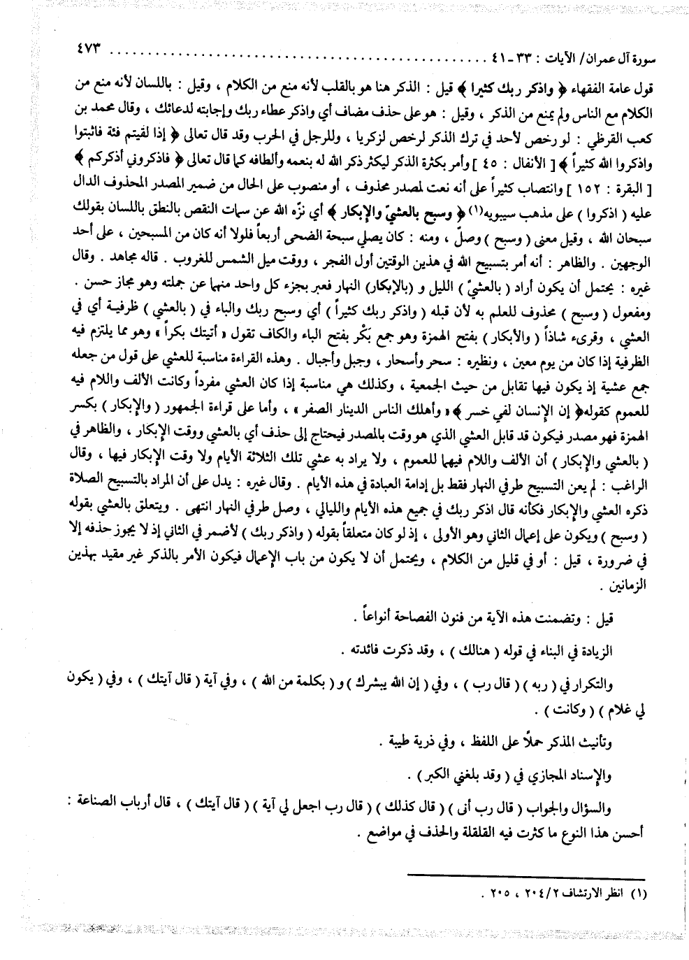 والظاهر أنه أمر بتسبيح الله في هذين الوقتين : أول الفجر ، ووقت ميل الشمس للغروب ، قاله مجاهد وقال غيره : يحتمل أن يكون أراد بالعشيّ الليل ، وبالإبكار النهار ، فعبر بجزء كل واحد منهما عن جملته ، وهو مجاز حسن .
