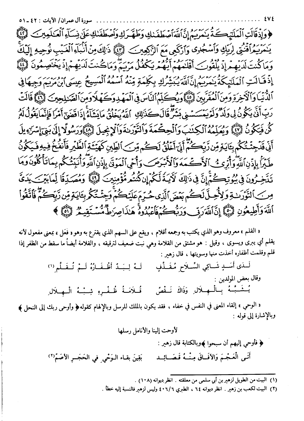 2 ( ) وَإِذْ قَالَتِ الْمَلَائِكَةُ يامَرْيَمُ إِنَّ اللَّهَ اصْطَفَاكِ وَطَهَّرَكِ وَاصْطَفَاكِ عَلَى نِسَآءِ الْعَالَمِينَ يامَرْيَمُ اقْنُتِى لِرَبِّكِ وَاسْجُدِى وَارْكَعِى مَعَ الرَاكِعِينَ ذالِكَ مِنْ أَنبَآءِ الْغَيْبِ نُوحِيهِ إِلَيْكَ وَمَا كُنتَ لَدَيْهِمْ إِذْ يُلْقُون أَقْلَامَهُمْ أَيُّهُمْ يَكْفُلُ مَرْيَمَ وَمَا كُنتَ لَدَيْهِمْ إِذْ يَخْتَصِمُونَ إِذْ قَالَتِ الْمَلَائِكَةُ يامَرْيَمُ إِنَّ اللَّهَ يُبَشِّرُكِ بِكَلِمَةٍ مِّنْهُ اسْمُهُ الْمَسِيحُ عِيسَى ابْنُ مَرْيَمَ وَجِيهًا فِي الدُّنْيَا وَالاٌّ خِرَةِ وَمِنَ الْمُقَرَّبِينَ وَيُكَلِّمُ النَّاسَ فِى الْمَهْدِ وَكَهْلاً وَمِنَ الصَّالِحِينَ قَالَتْ رَبِّ أَنَّى يَكُونُ لِى وَلَدٌ وَلَمْ يَمْسَسْنِى بَشَرٌ قَالَ كَذَالِكَ اللَّهُ يَخْلُقُ مَا يَشَآءُ إِذَا قَضَى أَمْرًا فَإِنَّمَا يَقُولُ لَهُ كُن فَيَكُونُ وَيُعَلِّمُهُ الْكِتَابَ وَالْحِكْمَةَ وَالتَّوْرَاةَ وَالإِنجِيلَ وَرَسُولاً إِلَى بَنِىإِسْرَاءِيلَ أَنِّى قَدْ جِئْتُكُمْ بِآيَةٍ مِّن رَّبِّكُمْ أَنِىأَخْلُقُ لَكُمْ مِّنَ الطِّينِ كَهَيْئَةِ الطَّيْرِ فَأَنفُخُ فِيهِ فَيَكُونُ طَيْرًا بِإِذْنِ اللَّهِ وَأُبْرِىءُ الاٌّ كْمَهَ والاٌّ بْرَصَ وَأُحْىِ الْمَوْتَى بِإِذْنِ اللَّهِ وَأُنَبِّئُكُم بِمَا تَأْكُلُونَ وَمَا تَدَّخِرُونَ فِى بُيُوتِكُمْ إِنَّ فِي ذالِكَ لأَيَةً لَّكُمْ إِن كُنتُم مُّؤْمِنِينَ وَمُصَدِّقًا لِّمَا بَيْنَ يَدَيَّ مِنَ التَّوْرَاةِ وَلاٌّ حِلَّ لَكُم بَعْضَ الَّذِي حُرِّمَ عَلَيْكُمْ وَجِئْتُكُمْ بِأَيَةٍ مِّن رَّبِّكُمْ فَاتَّقُواْ اللَّهَ وَأَطِيعُونِ إِنَّ اللَّهَ رَبِّى وَرَبُّكُمْ فَاعْبُدُوهُ هَاذَا صِرَاطٌ مُّسْتَقِيمٌ ( ) ) 2