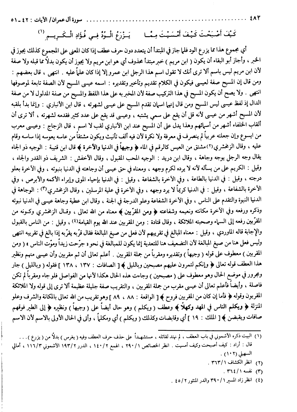 قال بعضهم : ومن قال إن المسيح صفة لعيسى ، فيكون في الكلام تقديم وتأخير تقديره : اسمه عيسى المسيح ، لأن الصفة تابعة لموصوفها . إنتهى . ولا يصح أن يكون المسيح في هذا التركيب صفة ، لأن المخبر به على هذا اللفظ ، والمسيح من صفة المدلول لا من صفة الدال ، إذ لفظ عيسى ليس المسيح .