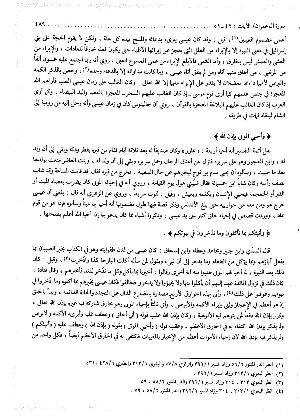 ( وَأُحْىِ الْمَوْتَى بِإِذْنِ اللَّهِ ( نقل أئمة التفسير أنه أحيا أربعة : عاذر ، وكان صديقاً له ، بعد ثلاثة أيام . فقام من قبره يقطر ودكه ، وبقي إلى أن ولد له . و : ابن العجوز ، وهو على سريره ، فنزل عن أعناق الرجال وحمل سريره وبقي إلى أن ولد له ، و : بنت العاشر ، متعث بولدها بعد ما حييت ، وسألوه أن يحيى سام بن نوح ليخبرهم عن حال السفينة ، فخرج من قبره فقال : أَقَدْ قامت الساعة ؟ وقد شاب نصف رأسه ، وكان شاباً ابن خمسمائة ، فقال : شيبني هول يوم القيامة .