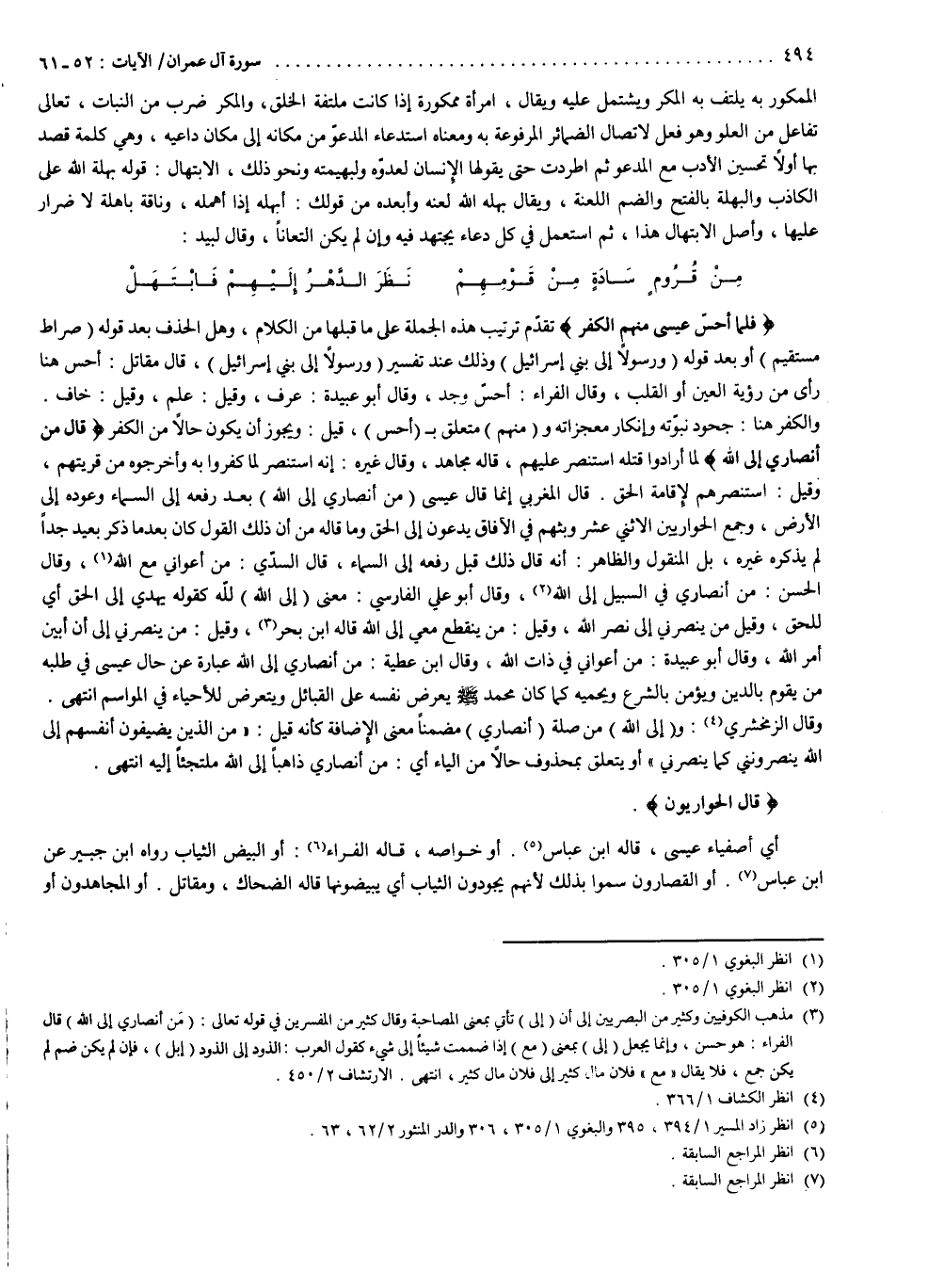 ) فَلَمَّا أَحَسَّ عِيسَى مِنْهُمُ الْكُفْرَ ( تقدّم ترتيب هذه الجملة على ما قبلها من الكلام ، وهل الحذف بعد قوله ) صِراطٍ مُّسْتَقِيمٍ ( أو بعد قوله : ) وَرَسُولاً إِلَى بَنِى إِسْراءيلَ ( وذلك عند تفسير ) وَرَسُولاً إِلَى بَنِى إِسْراءيلَ ).