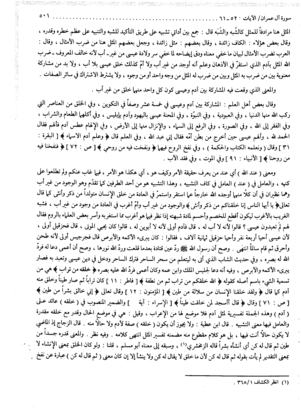 وقال بعض هؤلاء : الكاف زائدة . وقال بعضهم : مثل زائدة ، وجعل بعضهم المثل هنا من ضرب الأمثال . وقال : العرب تضرب الأمثال لبيان ما خفي معناه ودق إيضاحه ، لما خفي سر ولادة عيسى من غير أب ، لأنه خالف المعروف ، ضرب الله المثل بآدم الذي استقرّ في الأذهان . وعلم أنه أوجد من غير أب ولا أمّ ، كذلك خلق عيسى بلا أب ، ولا بد من مشاركة معنوية بين من ضرب به المثل ، وبين من ضرب له المثل ، من وجه واحد ، أو من وجوه لا يشترط الإشتراك في سائر الصفات . والمعنى الذي وقعت فيه المشاركة بين آدم وعيسى كون كل واحد منهما خلق من غير أب . وقال بعض أهل العلم : المشاركة بين ( آدم وعيسى في خمسة عشر وصفاً : في التكوين ، و : في الخلق من العناصر التي ركب الله منها الدنيا . وفي العبودية ، وفي النبوّة . وفي المحنة : عيسى باليهود ، وآدم بابليس ، وفي : أكلهما الطعام والشراب ، وفي الفقر إلى الله . وفي الصورة ، وفي الرفع إلى بالسماء والإنزال منها إلى الأرض ، وفي الإلهام ، عطس آدم فألهم ، فقال الحمد لله . وألهم عيسى ، حين أخرج من بطن أمّة فقال : ) إِنّى عَبْدُ اللَّهِ ( وفي العلم ، قال : ) وَعَلَّمَ ءادَمَ الاسْمَاء ( وقال : ) وَيُعَلّمُهُ الْكِتَابَ وَالْحِكْمَةَ ( وفي نفخ الروح فيهما ) وَنَفَخْتُ فِيهِ مِن رُّوحِى ( ) فَنَفَخْنَا فِيهِ مِن رُّوحِنَا ( وفي الموت ، وفي فقد الأب ، ومعنى : عند الله أي عند من يعرف حقيقة الأمر ، وكيف هو . أي : هكذا هو الأمر فيما غاب عنكم ولم تطلعوا على كنهه .