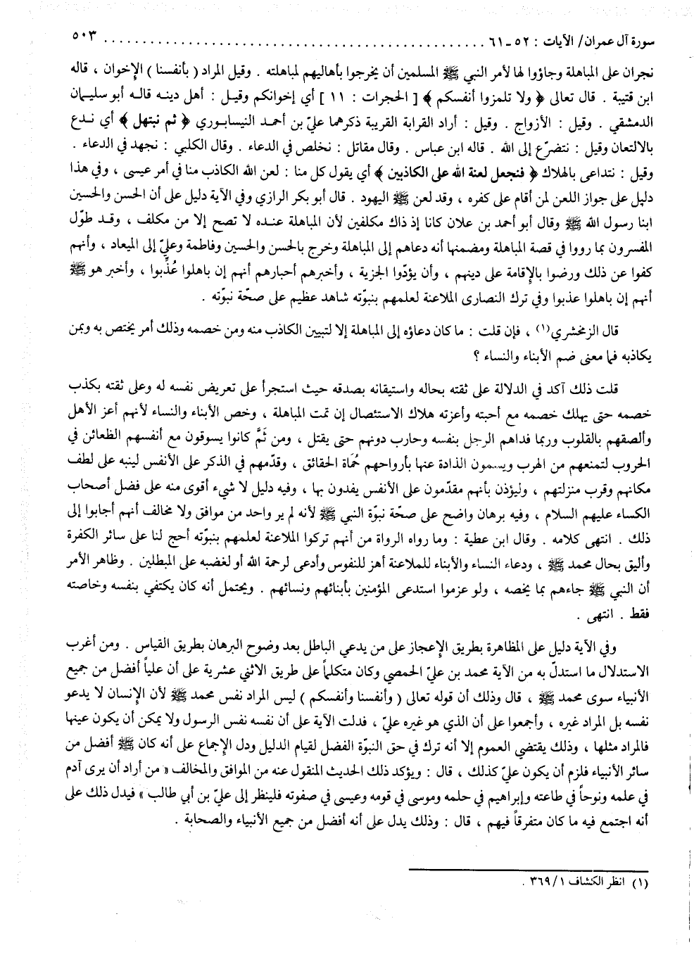 وفي الآية دليل على المظاهرة بطريق الإعجاز على من يدعي الباطل بعد وضوح البرهان بطريق القياس ، ومن أغرب الاستدلال ما استدلّ به من الآية محمد بن عليّ الحمصي . وكان متكلماً على طريق الإثنى عشرية . على : أن علينا أفضل من جميع الأنبياء سوى محمد ( صلى الله عليه وسلم ) ) . قال : وذلك أن قوله تعالى : ) وَأَنفُسَنَا وأَنفُسَكُمْ ( ليس المراد نفس محمد ( صلى الله عليه وسلم ) ) ، لأن الإنسان لا يدعو نفسه ، بل المراد غيره . وأجمعوا على أن الذي هو غيره : عليّ ، فدلت الآية على أن نفسه نفس الرسول ، ولا يمكن أن يكون عينها ، فالمراد مثلها ، وذلك يقتضي العموم إلاَّ أنه ترك في حق النبوّة الفضل لقيام الدليل ودل الإجماع على أنه كان ( صلى الله عليه وسلم ) ) أفضل من سائر الأنبياء ، فلزم أن يكون عليّ كذلك .