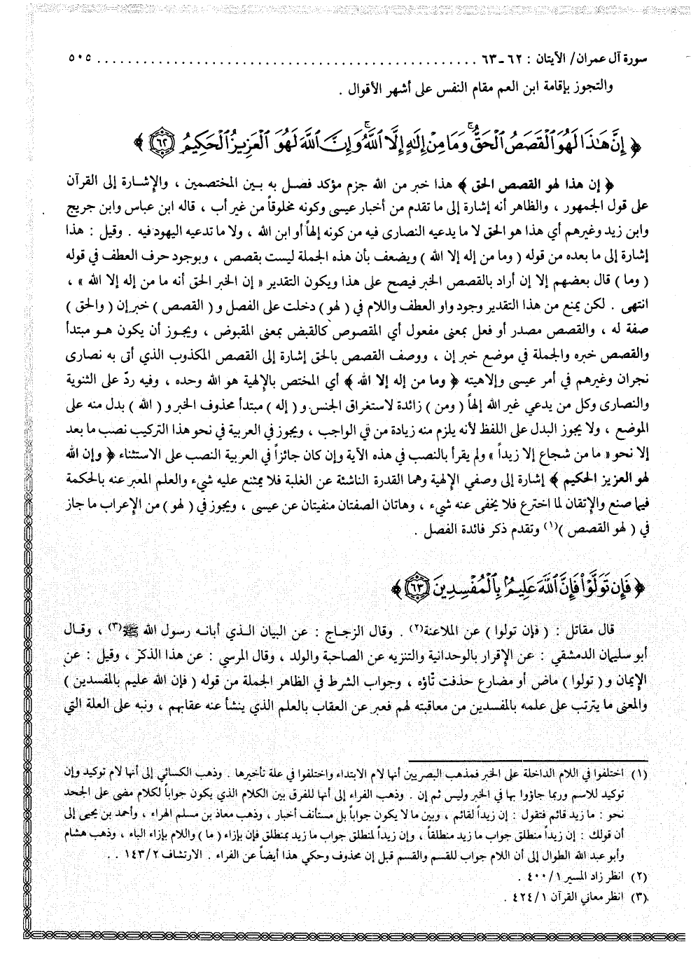 2 ( ) إِنَّ هَاذَا لَهُوَ الْقَصَصُ الْحَقُّ وَمَا مِنْ إِلَاهٍ إِلاَّ اللَّهُ وَإِنَّ اللَّهَ لَهُوَ الْعَزِيزُ الْحَكِيمُ فَإِن تَوَلَّوْاْ فَإِنَّ اللَّهَ عَلِيمٌ بِالْمُفْسِدِينَ قُلْ ياأَهْلَ الْكِتَابِ تَعَالَوْاْ إِلَى كَلِمَةٍ سَوَآءٍ بَيْنَنَا وَبَيْنَكُمْ أَلاَّ نَعْبُدَ إِلاَّ اللَّهَ وَلاَ نُشْرِكَ بِهِ شَيْئاً وَلاَ يَتَّخِذَ بَعْضُنَا بَعْضًا أَرْبَابًا مِّن دُونِ اللَّهِ فَإِن تَوَلَّوْاْ فَقُولُواْ اشْهَدُواْ بِأَنَّا مُسْلِمُونَ ياأَهْلَ الْكِتَابِ لِمَ تُحَآجُّونَ فِىإِبْرَاهِيمَ وَمَآ أُنزِلَتِ التَّورَاةُ وَالإْنْجِيلُ إِلاَّ مِن بَعْدِهِ أَفَلاَ تَعْقِلُونَ هاأَنتُمْ هَاؤُلاءِ حَاجَجْتُمْ فِيمَا لَكُم بِهِ عِلمٌ فَلِمَ تُحَآجُّونَ فِيمَا لَيْسَ لَكُمْ بِهِ عِلْمٌ وَاللَّهُ يَعْلَمُ وَأَنتُمْ لاَ تَعْلَمُونَ مَا كَانَ إِبْرَاهِيمُ يَهُودِيًّا وَلاَ نَصْرَانِيًّا وَلَكِن كَانَ حَنِيفًا مُّسْلِمًا وَمَا كَانَ مِنَ الْمُشْرِكِينَ إِنَّ أَوْلَى النَّاسِ بِإِبْرَاهِيمَ لَلَّذِينَ اتَّبَعُوهُ وَهَاذَا النَّبِىُّ وَالَّذِينَ ءَامَنُواْ وَاللَّهُ وَلِىُّ الْمُؤْمِنِينَ ( ) ) 2