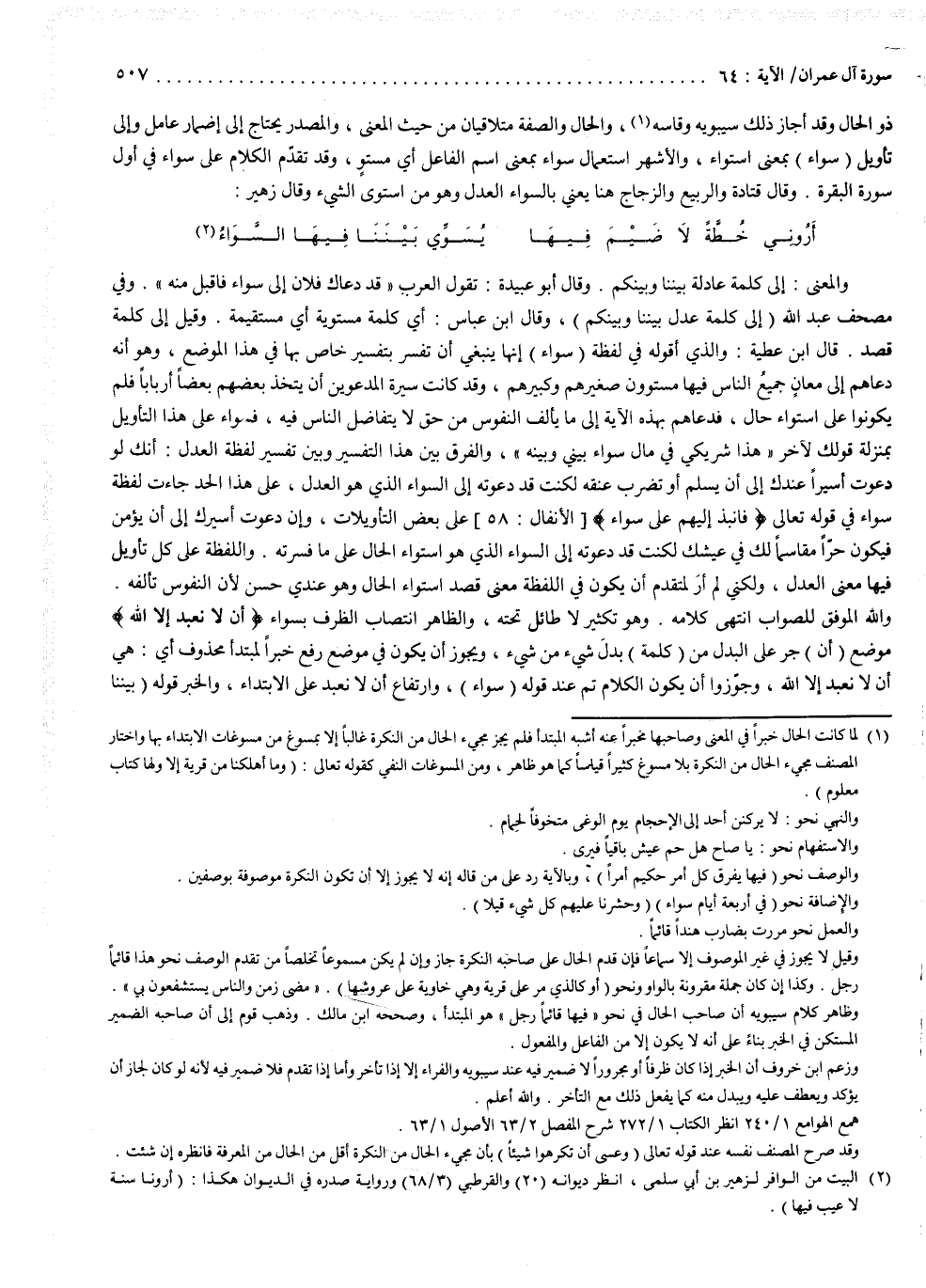 والمعنى : إلى كلمة عادلة بيننا وبينكم . وقال أبو عبيدة : تقول العرب : قد دعاك فلان إلى سواء فاقبل منه . وفي مصحف عبد الله : إلى كلمة عدل بيننا وبينكم . وقال ابن عباس : أي كلمة مستوية ، أي مستقيمة . وقيل : إلى كلمة قصد . قال ابن عطية : والذي أقوله في لفظة : سواء ، أنها ينبغي أن تفسر بتفسير خاص بها في هذا الموضع ، وهو أنه دعاهم إلى معان جميع الناس فيها مستوون ، صغيرهم وكبيرهم ، وقد كانت سيرة المدعوين أن يتخذ بعضهم بعضاً أرباباً ، فلم يكونوا على استواء حال ، فدعاهم بهذه الآية إلى ما يألف النفوس من حق لا يتفاضل الناس فيه ، فسواء على هذا التأويل بمنزلة قولك لآخر : هذا شريكي في مالً سواء بيني وبينه ، والفرق بين هذا التفسير وبين تفسير لفظة : العدل ، أنك لو دعوت أسيراً عندك إلى أن يسلم أو تضرب عنقه ، لكنت قد دعوته إلى السواء الذي هو العدل ، على هذا الحد جاءت لفظة : سواء ، في قوله تعالى ) فَانبِذْ إِلَيْهِمْ عَلَى سَوَاء ( على بعض التأويلات ، وإن دعوت أسيرك إلى أن يؤمن فيكون حرّاً مقاسماً لك . في عيشك لكنت قد دعوته إلى السواء الذي هو استواء الحال على ما فسرته واللفظة على كل تأويل فيها معنى العدل ، ولكني لم أر لمتقدم أن يكون في اللفظة معنى قصد استواء الحال ، وهو عندي حسن ، لأن النفوس تألفه ، والله الموفق للصواب . انتهى كلامه ، وهو تكثير لا طائل تحته ، والظاهر انتصاب الظرف بسواء .