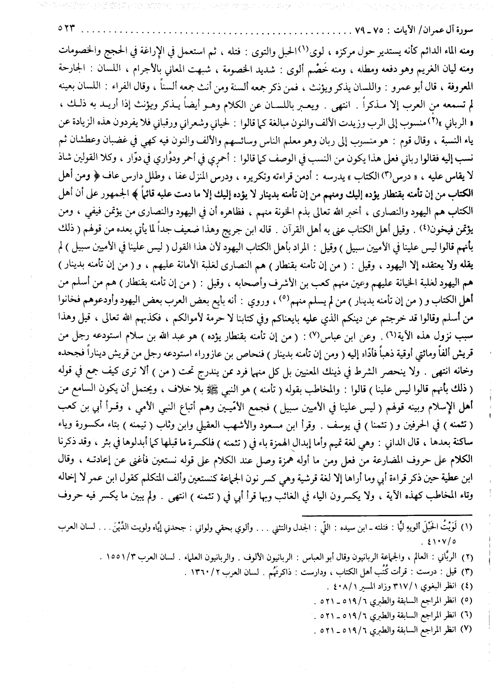 ( وَمِنْ أَهْلِ الْكِتَابِ مَنْ إِن تَأْمَنْهُ بِقِنْطَارٍ يُؤَدّهِ إِلَيْكَ وَمِنْهُمْ مَّنْ إِن تَأْمَنْهُ بِدِينَارٍ لاَّ يُؤَدِّهِ إِلَيْكَ إِلاَّ مَا ( الجمهور على أن أهل الكتاب هم اليهود والنصارى أخبر الله تعالى بذم الخونة منهم ، فظاهره أن في اليهود والنصارى من يؤتمن فيفي ومن يؤتمن فيخون . وقيل : أهل الكتاب عنى به أهل القرآن ، قاله ابن جريج . وهذا ضعيف حداً لما يأتي بعده من قولهم : ) ذالِكَ بِأَنَّهُمْ قَالُواْ لَيْسَ عَلَيْنَا فِى الامّيِينَ سَبِيلٌ ( وقيل : المراد بأهل الكتاب : اليهود ، لأن هذا القول ) لَيْسَ عَلَيْنَا فِى الامّيِينَ سَبِيلٌ ( لم يقله ولا يعتقده إلاَّ اليهود .