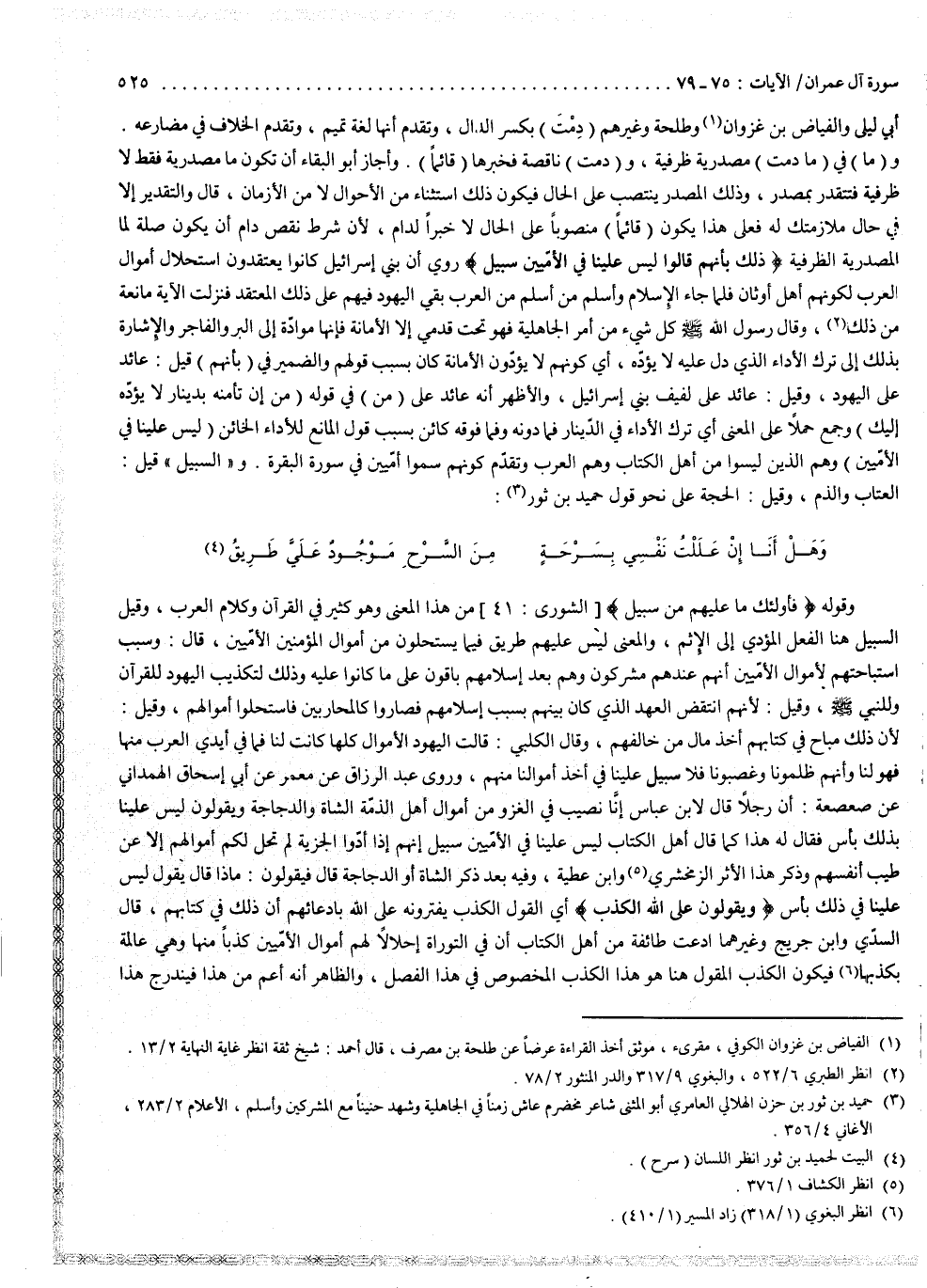( ذالِكَ بِأَنَّهُمْ قَالُواْ لَيْسَ عَلَيْنَا فِى الامّيِينَ سَبِيلٌ ( روي أن بني إسرائيل كانوا يعتقدون استحلال أموال . العرب لكونهم أهل أوثان ، فلما جاء الإسلام ، وأسلم من أسلم من العرب ، بقي اليهود فيهم على ذلك المعتقد ، فنزلت الآية مانعة من ذلك . وقال رسول الله ( صلى الله عليه وسلم ) ) : كل شيء من أمر الجاهلية فهو تحت قدمي ، إلاَّ الأمانة فإنها مؤادّة إلى البر والفاجر . ( والإشارة بذلك إلى ترك الأداء الذي دل عليه لا يؤدّه ، أي : كونهم لا يؤدّون الأمانة كان بسبب قولهم .