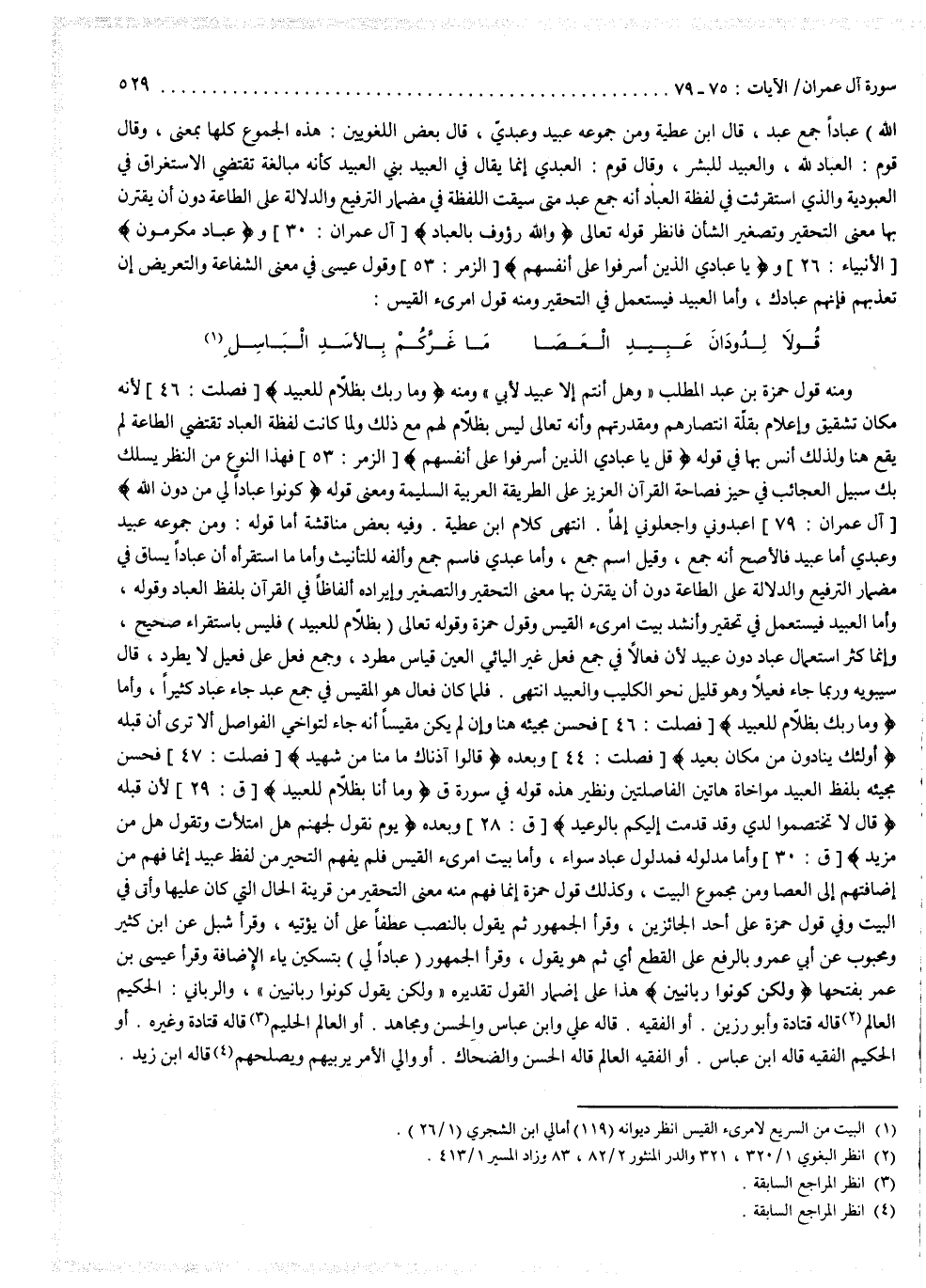 ومنه قول حمزة بن عبد المطلب : وهل أنتم إلاَّ عبيد لأبي ، ومنه ) وَمَا رَبُّكَ بِظَلَّامٍ لّلْعَبِيدِ ( لأنه مكان تشقيق وإعلام بقلة انتصارهم ومقدرتهم ، وأنه تعالى ليس بظلام لهم مع ذلك ، ولما كانت لفظة العباد تقتضي الطاعة ، لم يقع هنا ، ولذلك أنس بها في قوله : ) قُلْ ياأَهْلَ عِبَادِى الَّذِينَ أَسْرَفُواْ عَلَى أَنفُسِهِمْ ( فهذا النوع من النظر يسلك بك سبيل العجائب في حيز فصاحة القرآن العزيز على الطريقة العربية السليمة ، ومعنى قوله : ) كُونُواْ عِبَادًا لّى مِن دُونِ اللَّهِ ( اعبدوني واجعلوني إلهاً . انتهى كلام ابن عطية . وفيه بعض مناقشة .