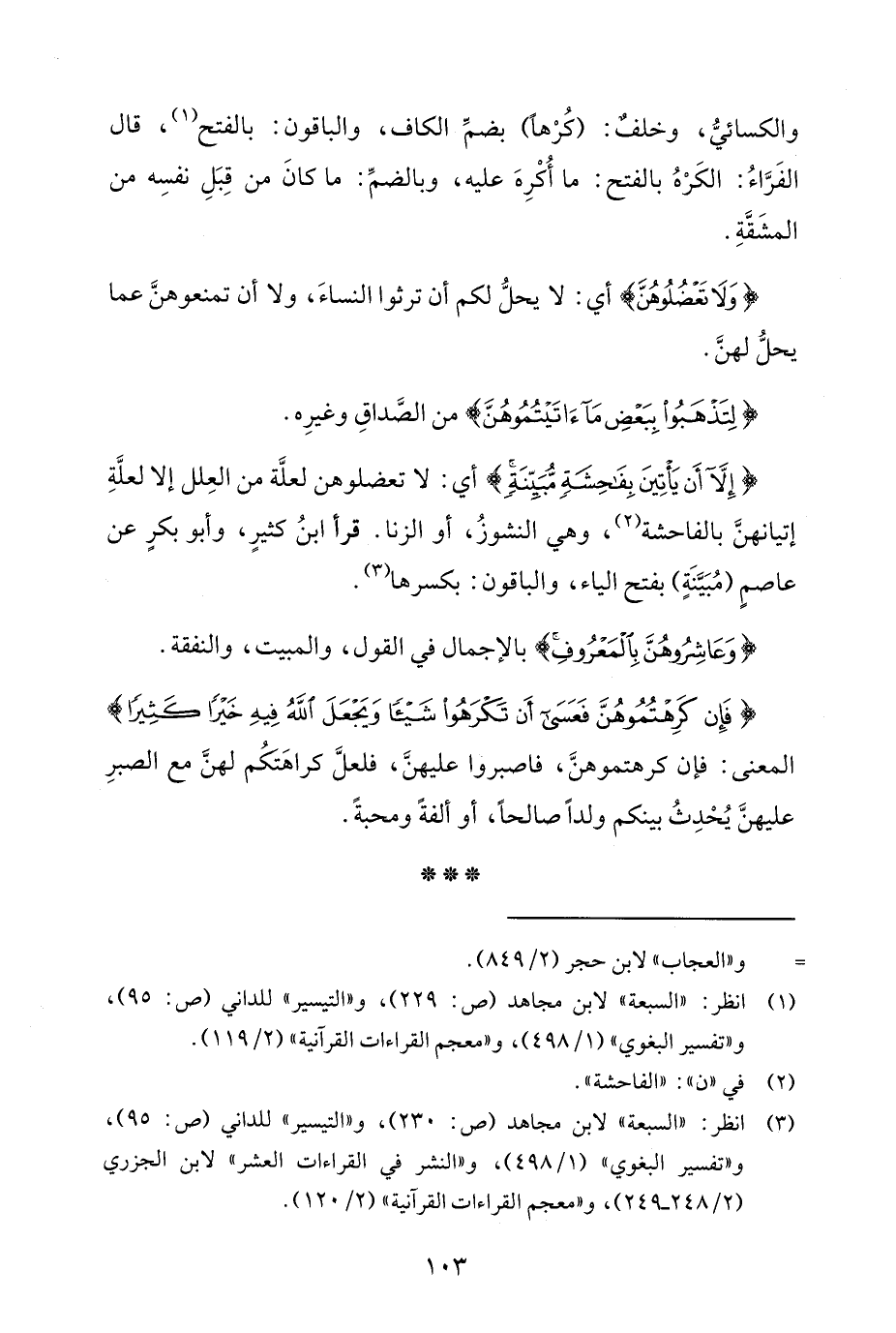 {إِلَّا أَنْ يَأْتِينَ بِفَاحِشَةٍ مُبَيِّنَةٍ} أي: لا تعضلوهن لعلَّة من العِلل إلا لعلَّةِ إتيانهنَّ بالفاحشة (¬2)، وهي النشوزُ، أو الزنا. قرأ ابنُ كثيرٍ، وأبو بكرٍ عن عاصمٍ (مُبَيَّنَةٍ) بفتح الياء، والباقون: بكسرها (¬3).