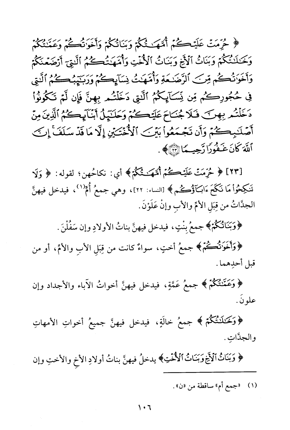 {حُرِّمَتْ عَلَيْكُمْ أُمَّهَاتُكُمْ وَبَنَاتُكُمْ وَأَخَوَاتُكُمْ وَعَمَّاتُكُمْ وَخَالَاتُكُمْ وَبَنَاتُ الْأَخِ وَبَنَاتُ الْأُخْتِ وَأُمَّهَاتُكُمُ اللَّاتِي أَرْضَعْنَكُمْ وَأَخَوَاتُكُمْ مِنَ الرَّضَاعَةِ وَأُمَّهَاتُ نِسَائِكُمْ وَرَبَائِبُكُمُ اللَّاتِي فِي حُجُورِكُمْ مِنْ نِسَائِكُمُ اللَّاتِي دَخَلْتُمْ بِهِنَّ فَإِنْ لَمْ تَكُونُوا دَخَلْتُمْ بِهِنَّ فَلَا جُنَاحَ عَلَيْكُمْ وَحَلَائِلُ أَبْنَائِكُمُ الَّذِينَ مِنْ أَصْلَابِكُمْ وَأَنْ تَجْمَعُوا بَيْنَ الْأُخْتَيْنِ إِلَّا مَا قَدْ سَلَفَ إِنَّ اللَّهَ كَانَ غَفُورًا رَحِيمًا (23)}.