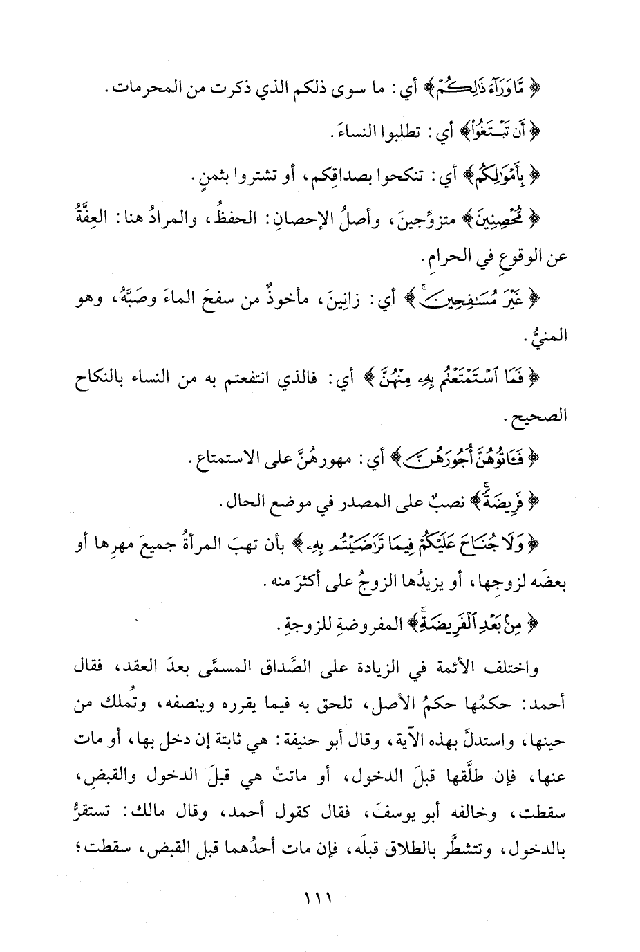 واختلف الأئمة في الزيادة على الصَّداق المسمَّى بعدَ العقد، فقال أحمد: حكمُها حكمُ الأصل، تلحق به فيما يقرره وينصفه، وتُملك من حينها، واستدلَّ بهذه الآية، وقال أبو حنيفة: هي ثابتة إن دخل بها، أو مات عنها، فإن طلَّقها قبلَ الدخول، أو ماتتْ هي قبلَ الدخول والقبضِ، سقطت، وخالفه أبو يوسفَ، فقال كقول أحمد، وقال مالك: تستقرُّ بالدخول، وتتشطَّر بالطلاق قبلَه، فإن مات أحدُهما قبل القبض، سقطت؛