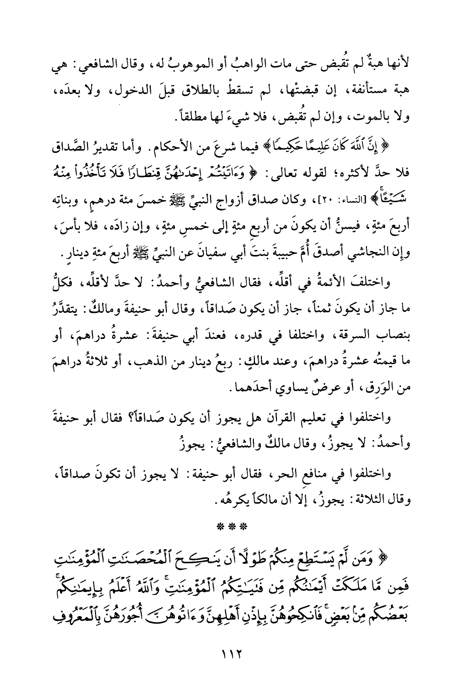 {إِنَّ اللَّهَ كَانَ عَلِيمًا حَكِيمًا} فيما شرعَ من الأحكام. وأما تقديرُ الصَّداق فلا حدَّ لأكثره؛ لقوله تعالى: {وَآتَيْتُمْ إِحْدَاهُنَّ قِنْطَارًا فَلَا تَأْخُذُوا مِنْهُ شَيْئًا} [النساء: 20]، وكان صداق أزواج النبيِّ - صلى الله عليه وسلم - خمسَ مئة درهمٍ، وبناتِه أربعَ مئةٍ، فيسنُّ أن يكونَ من أربعِ مئةٍ إلى خمسِ مئةٍ، وإن زادَه، فلا بأسَ، وإِن النجاشي أصدقَ أُمَّ حبيبةَ بنتَ أبي سفيانَ عن النبيِّ - صلى الله عليه وسلم - أربعَ مئةِ دينارٍ.