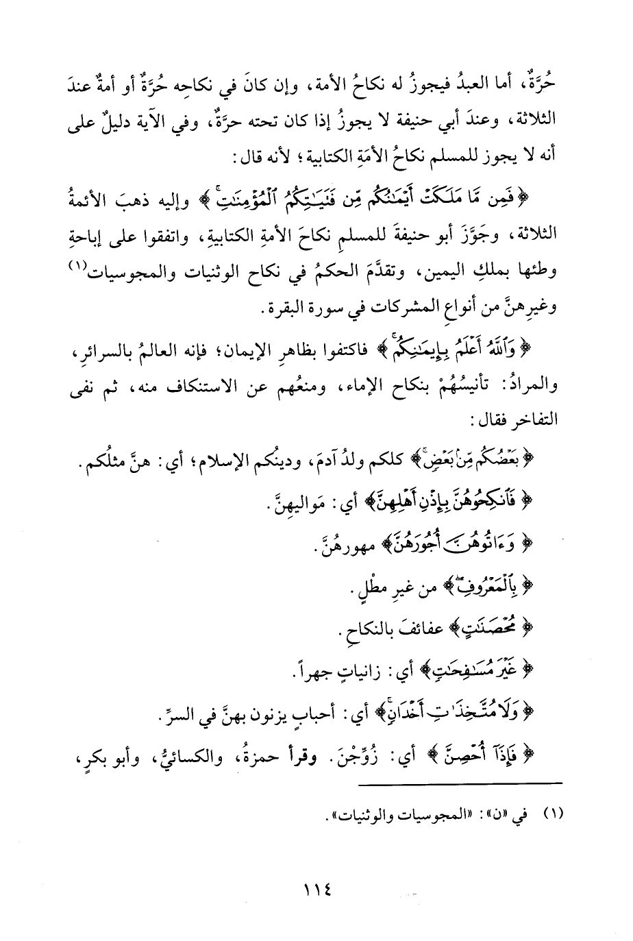 حُرَّةٌ، أما العبدُ فيجوزُ له نكاحُ الأمة، وإن كانَ في نكاحِه حُرَّةٌ أو أمةٌ عندَ الثلاثة، وعندَ أبي حنيفة لا يجوزُ إذا كان تحته حرَّةٌ، وفي الآية دليلٌ على أنه لا يجوز للمسلم نكاحُ الأمَةِ الكتابية؛ لأنه قال: