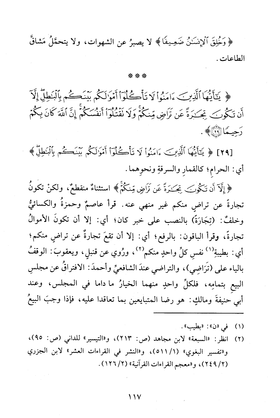 {إِلَّا أَنْ تَكُونَ تِجَارَةً عَنْ تَرَاضٍ مِنْكُمْ} استثناءٌ منقطعٌ، ولكنْ تكونُ تجارةً عن تراضٍ منكم غير منهي عنه. قرأ عاصمٌ وحمزةُ والكسائيُّ وخلفٌ: (تِجَارَةً) بالنصب على خبر كان؛ أي: إلا أن تكونَ الأموالُ تجارةً، وقرأ الباقون: بالرفع؛ أي: إلا أن تقعَ تجارة عن تراضٍ منكم؛ أي: بطيبةِ (¬1) نفسِ كلِّ واحدٍ منكم (¬2)، ورُوي عن قنبلٍ، ويعقوبَ: الوقفُ بالياء على (تَرَاضِي)، والتراضي عندَ الشافعيِّ وأحمدَ: الافتراقُ عن مجلسِ البيعِ بتمامِه، فلكلِّ واحدٍ منهما الخيارُ ما داما في المجلس، وعند أبي حنيفةَ ومالكٍ: هو رضا المتبايعين بما تعاقدا عليه، فإذا وجبَ البيعُ