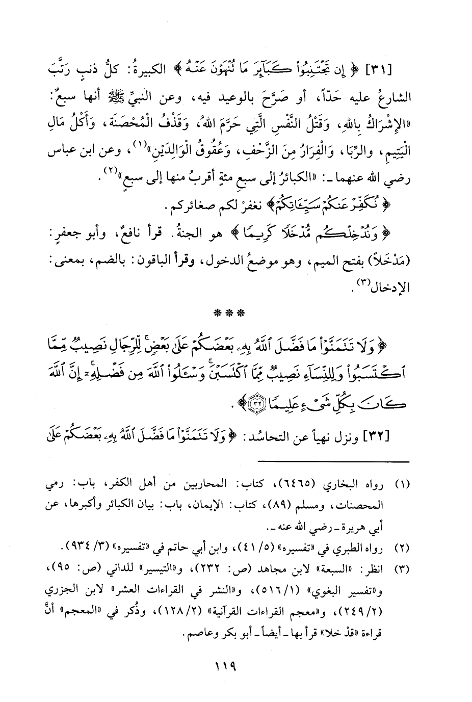 [31] {إِنْ تَجْتَنِبُوا كَبَائِرَ مَا تُنْهَوْنَ عَنْهُ} الكبيرةُ: كلُّ ذنبٍ رَتَّبَ الشارعُ عليه حَدًّا، أو صَرَّحَ بالوعيد فيه، وعن النبيِّ - صلى الله عليه وسلم - أنها سبعٌ: "الإِشْرَاكُ بِاللهِ، وَقَتْلُ النَّفْسِ الَّتِي حَرَّمَ اللهُ، وَقَذْفُ الْمُحْصَنَة، وَأَكْلُ مَالِ الْيَتِيمِ، والرِّبَا، وَالْفِرَارُ مِنَ الزَّحْفِ، وَعُقُوقُ الْوَالِدَيْنِ" (¬1)، وعن ابن عباس -رضي الله عنهما-: "الكبائرُ إلى سبعِ مئةٍ أقربُ منها إلى سبعٍ" (¬2).