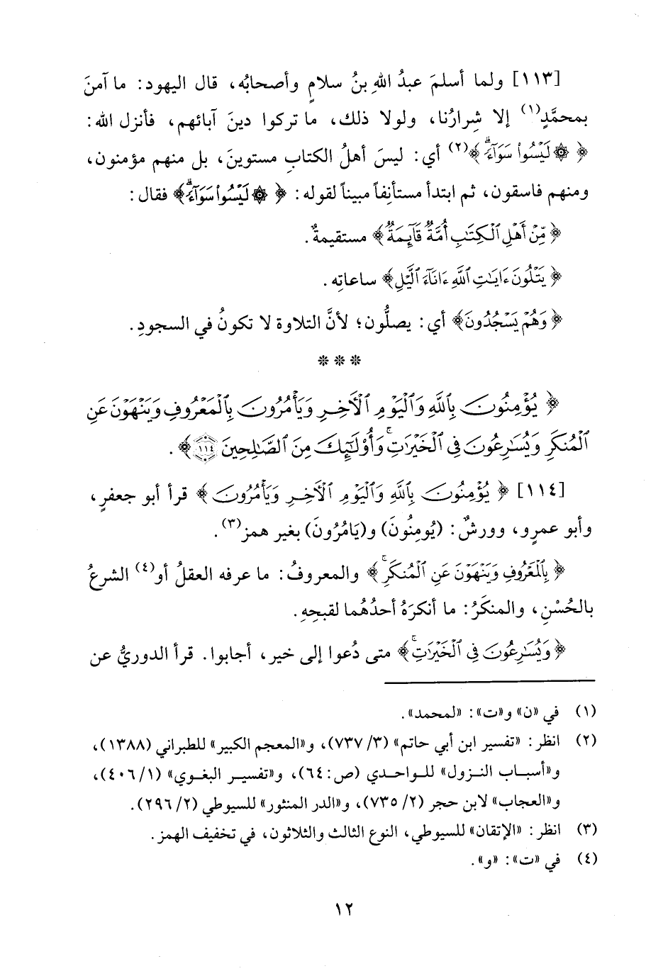 [114] {يُؤْمِنُونَ بِاللَّهِ وَالْيَوْمِ الْآخِرِ وَيَأْمُرُونَ} قرأ أبو جعفرٍ، وأبو عمرٍو، وورشٌ: (يُومِنُونَ) و (يَامُرُونَ) بغير همز (¬3).