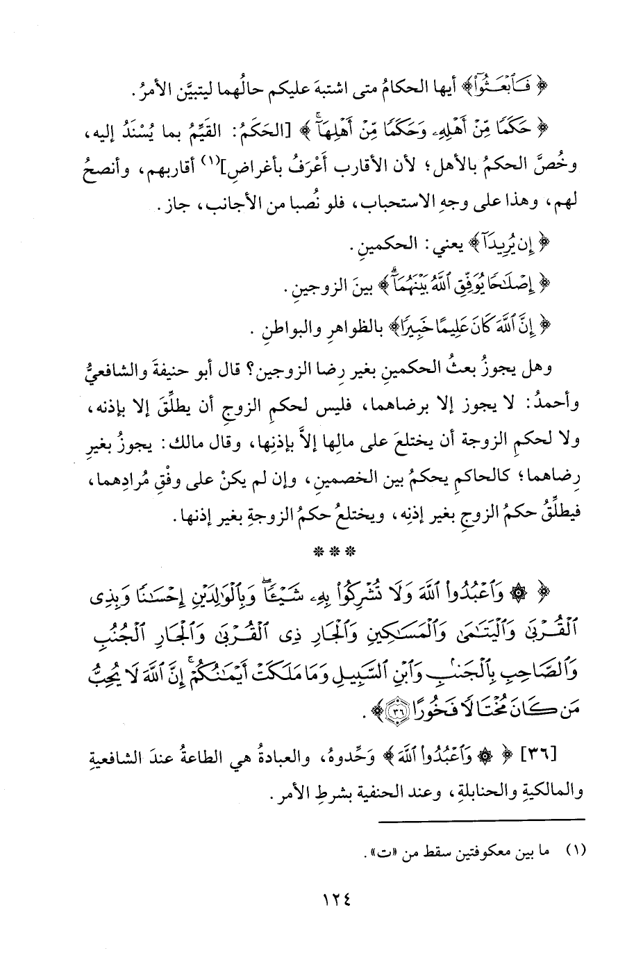 [36] {وَاعْبُدُوا اللَّهَ} وَحِّدوهُ، والعبادةُ هي الطاعةُ عندَ الشافعيةِ والمالكيةِ والحنابلةِ، وعند الحنفية بشرطِ الأمر.