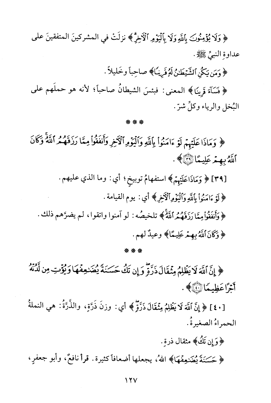 [40] {إِنَّ اللَّهَ لَا يَظْلِمُ مِثْقَالَ ذَرَّةٍ} أي: وزنَ ذَرَّةٍ، والذَّرَّةُ: هي النملةُ الحمراءُ الصغيرةُ.