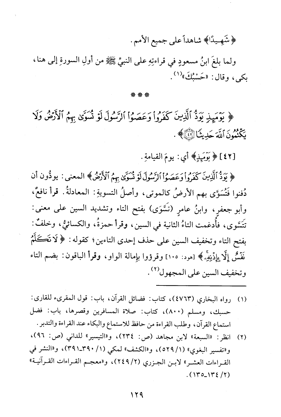 {يَوَدُّ الَّذِينَ كَفَرُوا وَعَصَوُا الرَّسُولَ لَوْ تُسَوَّى بِهِمُ الْأَرْضُ} المعنى: يودُّون أن دُفنوا فَتُسَوَّى بهم الأرضُ كالموتى، وأصلُ التسويةِ: المعادلةُ. قرأ نافعٌ، وأبو جعفرٍ، وابنُ عامرٍ (تَسَّوَى) بفتح التاء وتشديد السين على معنى: تَتَسَّوى، فأُدغمت التاءُ الثانية في السين، وقرأ حمزةُ، والكسائيُّ، وخلفٌ: بفتح التاء وتخفيف السين على حذف إحدى التاءين؛ كقوله: {لَا تَكَلَّمُ نَفسٌ إِلَّا بِإِذنِه} [هود: 105] وقرؤوا بإِمالة الواو، وقرأ الباقون: بضم التاء وتخفيف السين على المجهول (¬2).