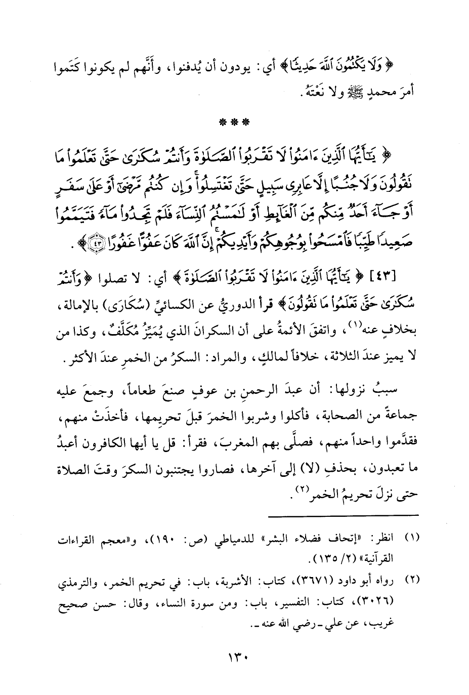 [43] {يَاأَيُّهَا الَّذِينَ آمَنُوا لَا تَقْرَبُوا الصَّلَاةَ} أي: لا تصلوا {يَاأَيُّهَا الَّذِينَ آمَنُوا لَا تَقْرَبُوا الصَّلَاةَ} قرأ الدوريُّ عن الكسائيِّ (سُكَارَى) بالإمالة، بخلافٍ عنه (¬1)، واتفقَ الأئمةُ على أن السكرانَ الذي يُمَيِّزُ مُكَلَّفٌ، وكذا من لا يميز عندَ الثلاثة، خلافًا لمالكٍ، والمراد: السكرُ من الخمرِ عندَ الأكثر.
