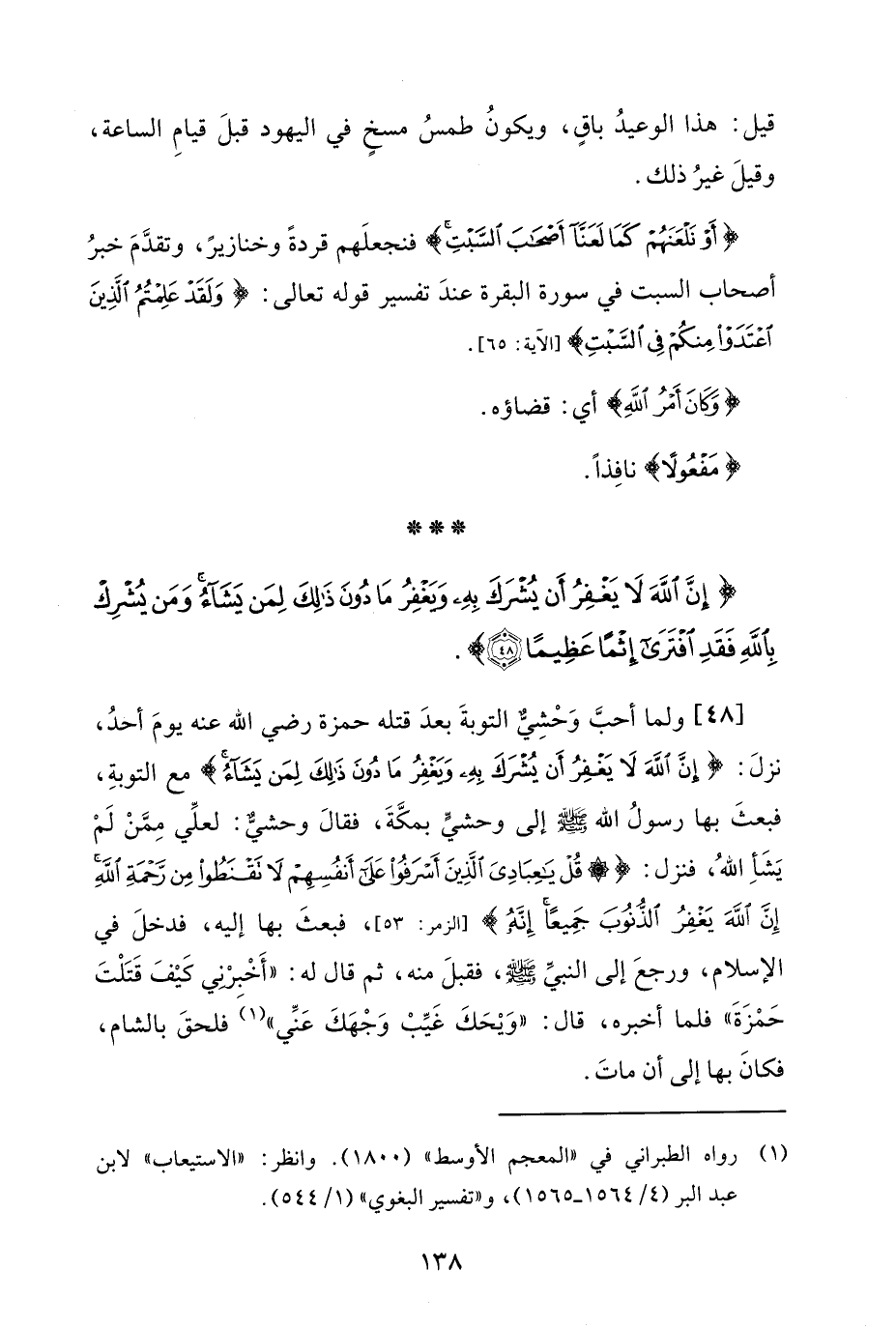 [48] ولما أحبَّ وَحْشِيٌّ التوبةَ بعدَ قتله حمزة رضي الله عنه يومَ أحدُ، نزلَ: {إِنَّ اللَّهَ لَا يَغْفِرُ أَنْ يُشْرَكَ بِهِ وَيَغْفِرُ مَا دُونَ ذَلِكَ لِمَنْ يَشَاءُ} مع التوبةِ، فبعثَ بها رسولُ الله - صلى الله عليه وسلم - إلى وحشيٍّ بمكَّةَ، فقالَ وحشيٌّ: لعلِّي مِمَّنْ لَمْ يَشَأِ اللهُ، فنزل: {قُلْ يَاعِبَادِيَ الَّذِينَ أَسْرَفُوا عَلَى أَنْفُسِهِمْ لَا تَقْنَطُوا مِنْ رَحْمَةِ اللَّهِ إِنَّ اللَّهَ يَغْفِرُ الذُّنُوبَ جَمِيعًا إِنَّهُ} [الزمر: 53]، فبعثَ بها إليه، فدخلَ في الإسلام، ورجعَ إلى النبي - صلى الله عليه وسلم -، فقبلَ منه، ثم قال له: "أَخْبِرْنِي كَيْفَ قَتَلْتَ حَمْزَةَ" فلما أخبره، قال: "وَيْحَكَ غَيِّبْ وَجْهَكَ عَنِّي" (¬1) فلحقَ بالشام، فكانَ بها إلى أن ماتَ.