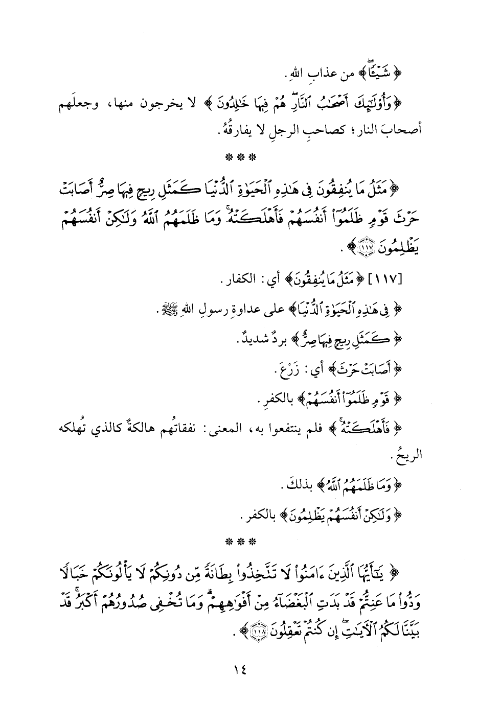 {مَثَلُ مَا يُنْفِقُونَ فِي هَذِهِ الْحَيَاةِ الدُّنْيَا كَمَثَلِ رِيحٍ فِيهَا صِرٌّ أَصَابَتْ حَرْثَ قَوْمٍ ظَلَمُوا أَنْفُسَهُمْ فَأَهْلَكَتْهُ وَمَا ظَلَمَهُمُ اللَّهُ وَلَكِنْ أَنْفُسَهُمْ يَظْلِمُونَ (117)}.