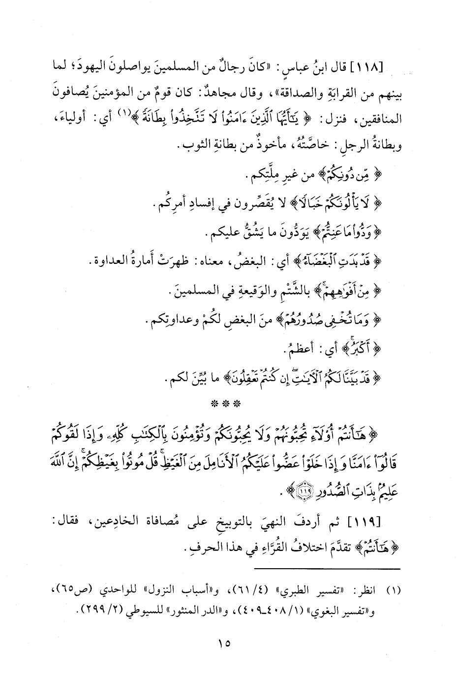[118] قال ابنُ عباسٍ: "كانَ رجالٌ من المسلمينَ يواصلونَ اليهودَ؛ لما بينهم من القرابَةِ والصداقة"، وقال مجاهدٌ: كان قومٌ من المؤمنينَ يُصافونَ المنافقين، فنزل: {يَاأَيُّهَا الَّذِينَ آمَنُوا لَا تَتَّخِذُوا بِطَانَة} (¬1) أي: أولياءَ، وبطانةُ الرجلِ: خاصَّتُهُ، مأخوذٌ من بطانةِ الثوب.