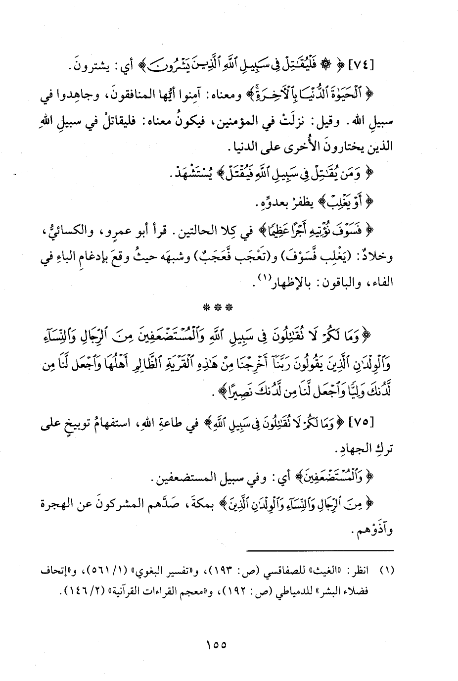 [74] {فَلْيُقَاتِلْ فِي سَبِيلِ اللَّهِ الَّذِينَ يَشْرُونَ} أي: يشترونَ.
