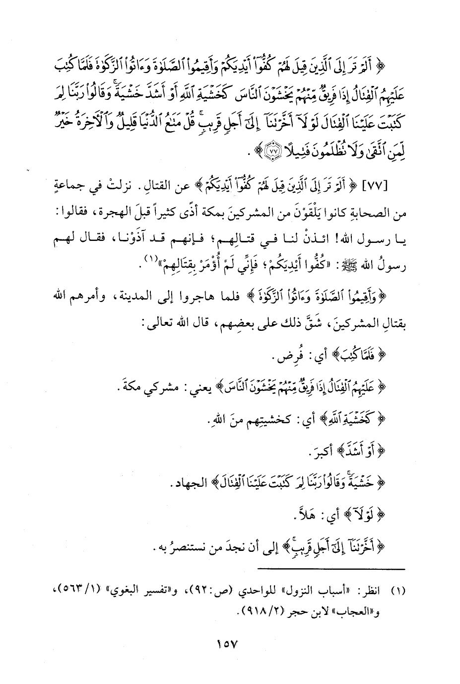 [77] {أَلَمْ تَرَ إِلَى الَّذِينَ قِيلَ لَهُمْ كُفُّوا أَيْدِيَكُمْ} عن القتالِ. نزلتْ في جماعةٍ من الصحابةِ كانوا يَلْقَوْنَ من المشركينَ بمكة أذًى كثيرًا قبلَ الهجرة، فقالوا: يا رسول الله! ائذنْ لنا في قتالِهم، فإنهم قد آذَوْنا، فقال لهم رسولُ الله - صلى الله عليه وسلم -: "كُفُّوا أَيْدِيَكُمْ؛ فَإِنِّي لَمْ أُؤْمَرْ بِقِتَالِهِمْ" (¬1).