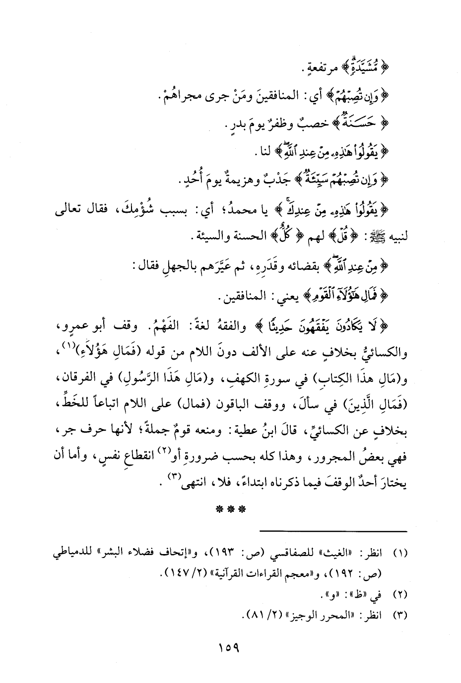 {لَا يَكَادُونَ يَفْقَهُونَ حَدِيثًا} والفقهُ لغةً: الفَهْمُ. وقف أبو عمرٍو، والكسائيُّ بخلافٍ عنه على الألف دونَ اللام من قوله (فَمَالِ هَؤُلاَءِ) (¬1)، و (مَالِ هذَا الكِتابِ) في سورةِ الكهفِ، و (مَالِ هَذَا الرَّسُولِ) في الفرقان، (فَمَالِ الَّذِينَ) في سألَ، ووقف الباقون (فمال) على اللام اتباعًا للخَطِّ، بخلافٍ عن الكسائيِّ، قالَ ابنُ عطية: ومنعه قومٌ جملةً؛ لأنها حرف جر، فهي بعضُ المجرور، وهذا كله بحسب ضرورةِ أو (¬2) انقطاعِ نفسٍ، وأما أن يختارَ أحدٌ الوقفَ فيما ذكرناه ابتداءً، فلا، انتهى (¬3).