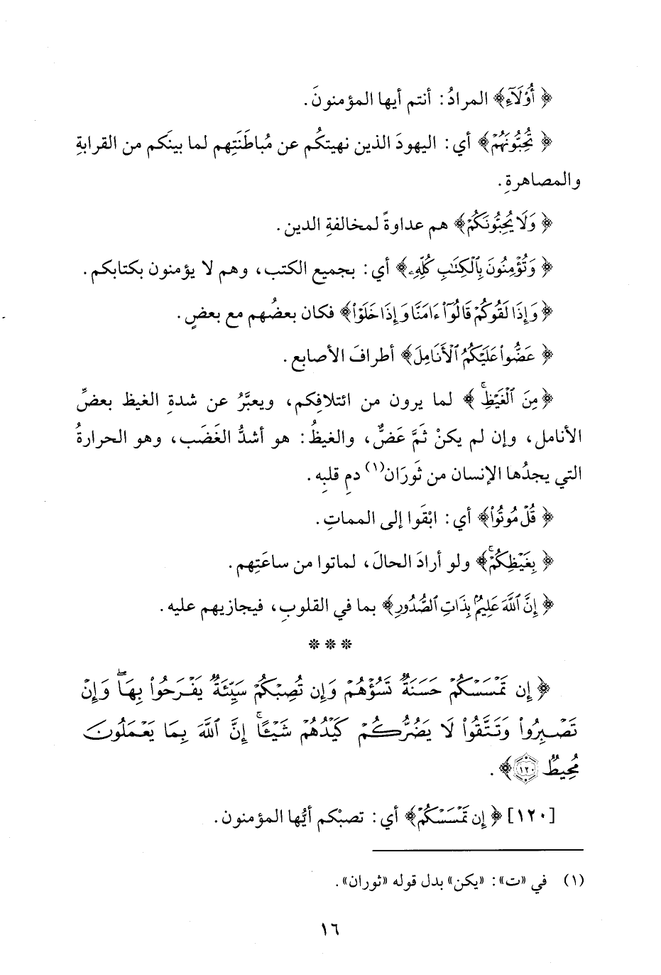 {إِنْ تَمْسَسْكُمْ حَسَنَةٌ تَسُؤْهُمْ وَإِنْ تُصِبْكُمْ سَيِّئَةٌ يَفْرَحُوا بِهَا وَإِنْ تَصْبِرُوا وَتَتَّقُوا لَا يَضُرُّكُمْ كَيْدُهُمْ شَيْئًا إِنَّ اللَّهَ بِمَا يَعْمَلُونَ مُحِيطٌ (120)}.