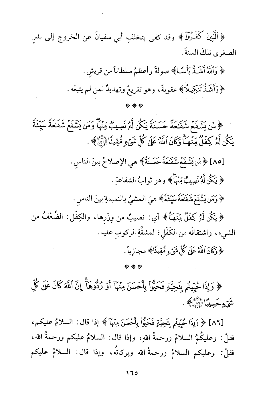 [85] {مَنْ يَشْفَعْ شَفَاعَةً حَسَنَةً} هي الإصلاحُ بينَ الناسِ.