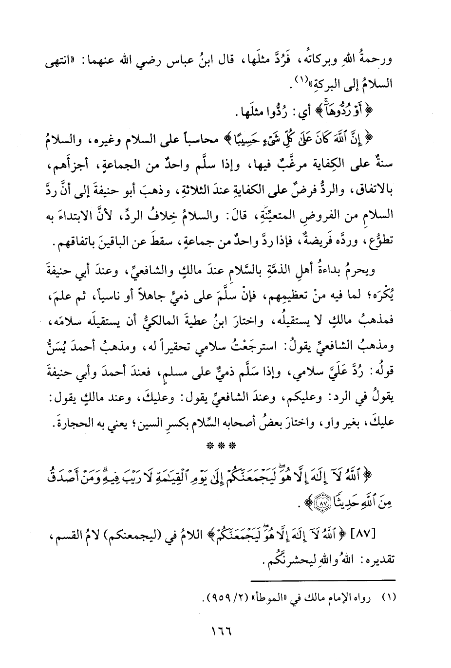 {إِنَّ اللَّهَ كَانَ عَلَى كُلِّ شَيْءٍ حَسِيبًا} محاسبًا على السلام وغيره، والسلامُ سنةٌ على الكِفاية مرغَّبٌ فيها، وإذا سلَّم واحدٌ من الجماعةٍ، أجزأَهم، بالاتفاق، والردُّ فرضٌ على الكفايةِ عندَ الثلاثةِ، وذهبَ أبو حنيفةَ إلى أنَّ ردَّ السلامِ من الفروضِ المتعيِّنَةِ، قالَ: والسلامُ خِلافُ الردِّ، لأنَّ الابتداءَ به تطوُّع، وردَّه فَريضةٌ، فإذا ردَّ واحدٌ من جماعةٍ، سقطَ عن الباقينَ باتفاقهم.