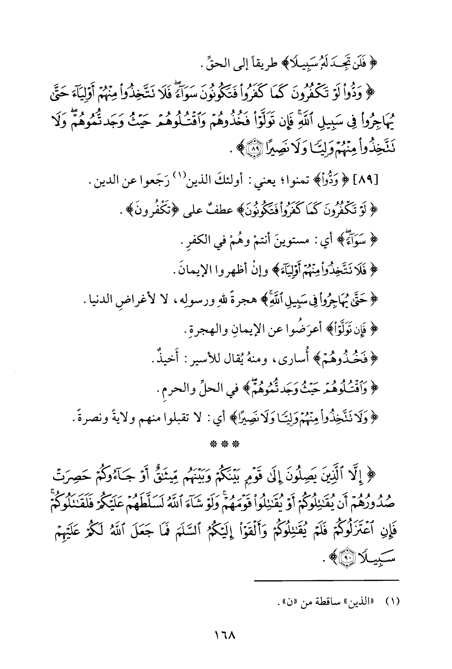 {وَدُّوا لَوْ تَكْفُرُونَ كَمَا كَفَرُوا فَتَكُونُونَ سَوَاءً فَلَا تَتَّخِذُوا مِنْهُمْ أَوْلِيَاءَ حَتَّى يُهَاجِرُوا فِي سَبِيلِ اللَّهِ فَإِنْ تَوَلَّوْا فَخُذُوهُمْ وَاقْتُلُوهُمْ حَيْثُ وَجَدْتُمُوهُمْ وَلَا تَتَّخِذُوا مِنْهُمْ وَلِيًّا وَلَا نَصِيرًا (89)}.