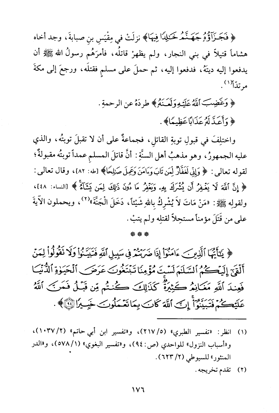 {فَجَزَاؤُهُ جَهَنَّمُ خَالِدًا فِيهَا} نزلَتْ في مِقْيَسِ بنِ صبابةَ، وجد أخاه هشامًا قتيلًا في بني النجار، ولم يظهرْ قاتلُه، فأمرَهُم رسولُ الله - صلى الله عليه وسلم - أن يدفعوا إليه ديتَهُ، فدفعوا إليه، ثم حملَ على مسلمٍ فقتلَه، ورجعَ إلى مكةَ مرتدًّا (¬1).