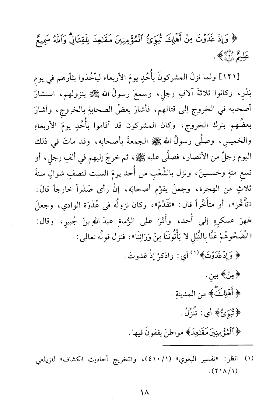 [121] ولما نزلَ المشركونَ بأُحُدٍ يومَ الأربعاء ليأخُذوا بثأرهم في يومِ بَدْرٍ، وكانوا ثلاثةَ آلافِ رجلٍ، وسمعَ رسولُ الله - صلى الله عليه وسلم - بنزولهم، استشارَ أصحابه في الخروج إلى قتالهم، فأشارَ بعضُ الصحابةِ بالخروجِ، وأشارَ بعضهم بترك الخروج، وكان المشركون قد أقاموا بأُحُدٍ يومَ الأربعاءِ والخميسِ، وصلَّى رسولُ الله - صلى الله عليه وسلم - الجمعةَ بأصحابه، وقد ماتَ في ذلك اليوم رجلٌ من الأنصار، فصلَّى عليه - صلى الله عليه وسلم -، ثم خرجَ إليهم في ألفِ رجلٍ، أو تسعِ مئةٍ وخمسينَ، ونزل بالشِّعْبِ من أُحد يومَ السبت لنصفِ شوالٍ سنةَ ثلاثٍ من الهجرة، وجعلَ يقوِّم أصحابَه، إنْ رأى صَدْرًا خارجًا قالَ: "تَأَخَّرْ"، أو متأَخِّرًا قال: "تَقَدَّمْ"، وكان نزولُه في عُدْوَة الوادي، وجعلَ ظهرَ عسكرِهِ إلى أُحد، وأَمَّرَ على الرُّماةِ عبدَ اللهِ بنَ جُبيرٍ، وقال: "انْضَحُوهُمْ عَنَّا بِالنَّبْلِ لا يَأْتُونَنَا مِنْ وَرَائِنَا"، فنزل قولُه تعالى: